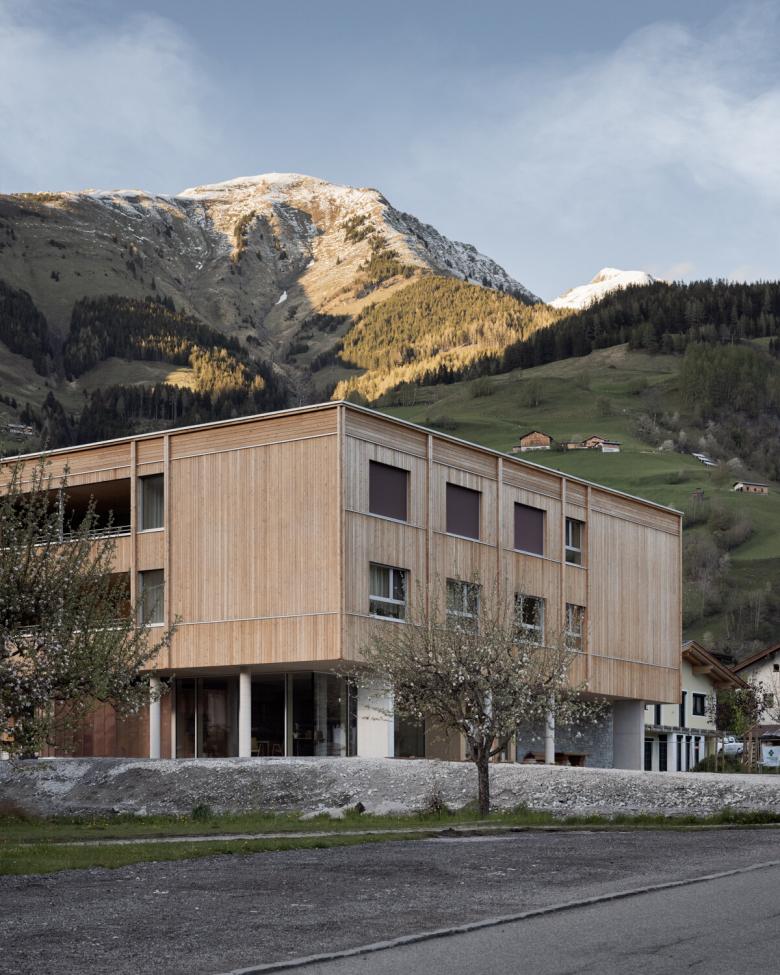 Der Neubau der einzelnen Baukörper ist als konstruktiver Holzhybridbau konzipiert, dessen Erscheinungsbild mit sägerauer Lärchenfassade Bezug zur umliegenden Bebauung und Landschaft herstellt.