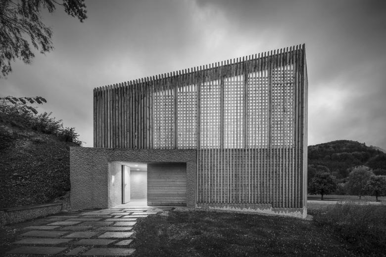 Die, in der Verlängerung einer alten Schottergrube situierte Auferstehungskapelle definiert durch seine Lage einen neuen Ort der Begegnung für Straß. Eine, dem Hang entgegengestellte, Betonklammer bildet den markanten Abschluss der örtlichen Topografie und definiert die Adresse der Kapelle. Über einen leger ausformulierten Vorplatz wird man durch einen gedeckten Zugang in den Vorraum geleitet, von wo aus man am Ende umgelenkt und von rückwärts in den offenen, noch oben strebenden Kapellenraum geleitet wird.