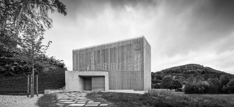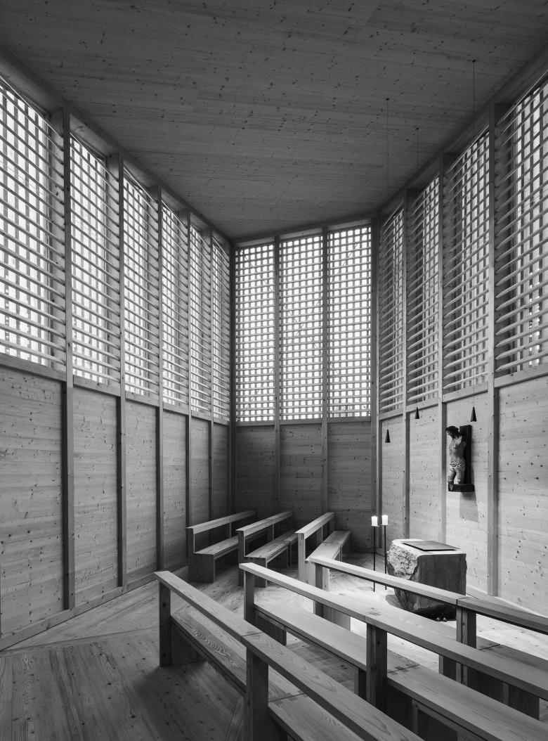 Dieser erzeugt durch seine Reduktion auf Konstruktion und Materialität eine Atmosphäre, die den Alltag ausblendet und so zum Innehalten einlädt. Nach oben hin lösen sich die raumbildenden Wände in ihre Konstruktion auf und erzeugen in Kombination mit der vertikalen Fassadenstruktur, den horizontalen Lamellen im Innenraum und dem Lichteinfall eine sakrale Stimmung und unverwechselbare Identität.