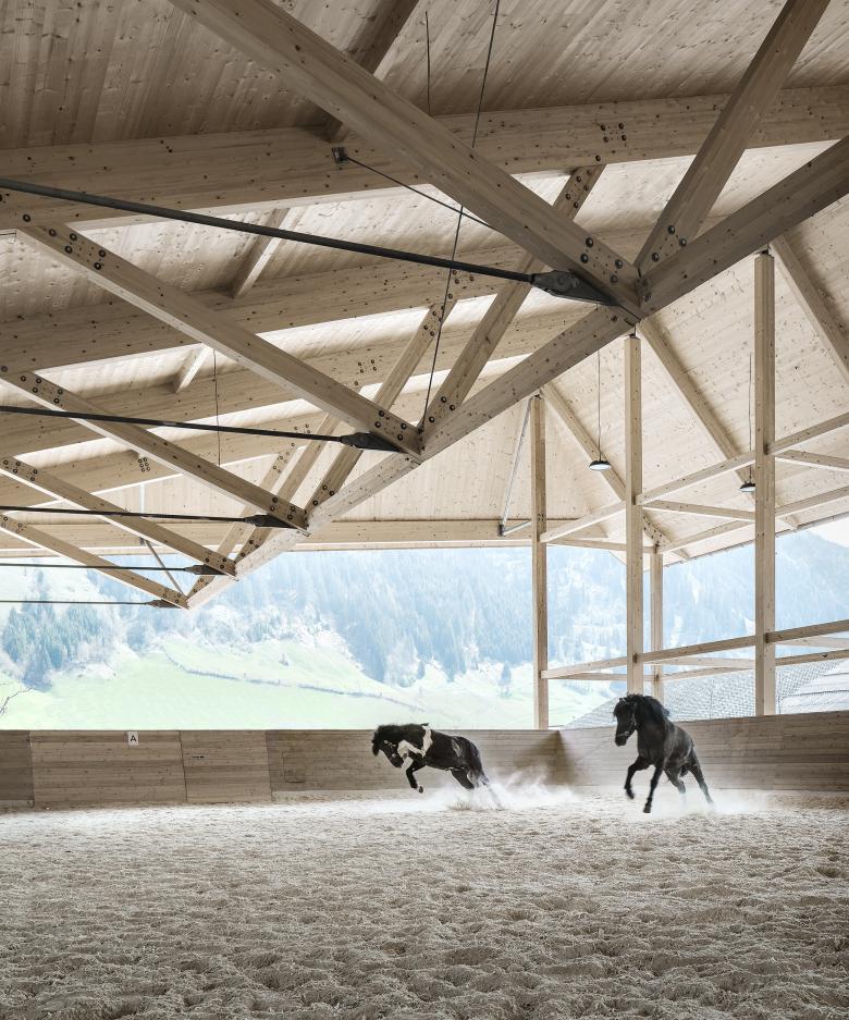 Die neue Reithalle bildet den nördlichen Abschluss der gesamten Hotelanlage und verortet sich mit Form und Materialität selbstverständlich in die vorhandene Umgebung!