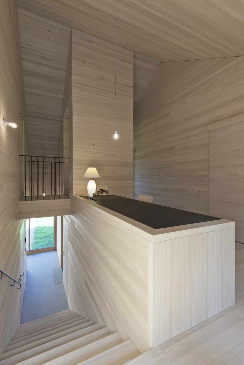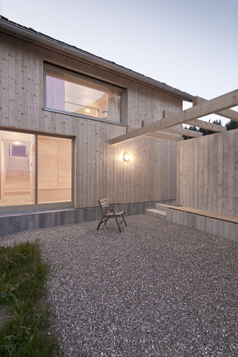 Anstelle eines bescheidenen gemauerten Wohnhauses mit benachbartem Stall entstand der kleine, locker gruppierte "Weiler" aus zwei Wohnhäusern und kleinem Gerätehaus. Das ursprüngliche Ensemble am Waldrand strahlte eine gewachsene und entspannte Atmosphäre aus. Vom "genius loci" inspiriert, interpretierte der Architekt die traditionellen Holzbauten im ländlichen Raum neu: So findet sich die optische Durchlässigkeit der Vertikalschalungen landwirtschaftlicher Bauten bei der Gestaltung der Stirnseite mit dahinterliegender Erschließungszone. Text: NM