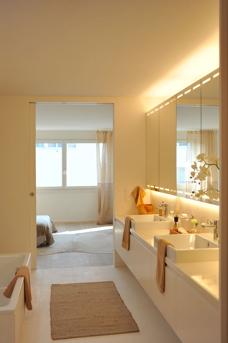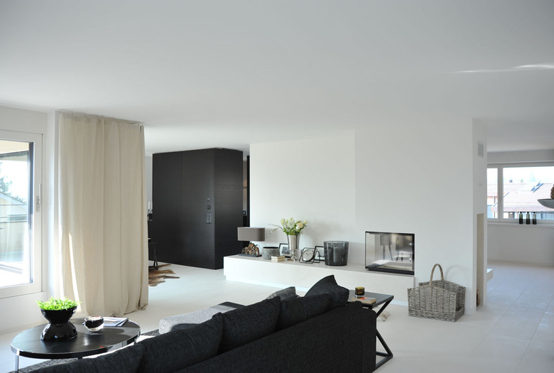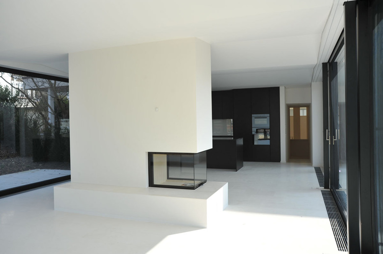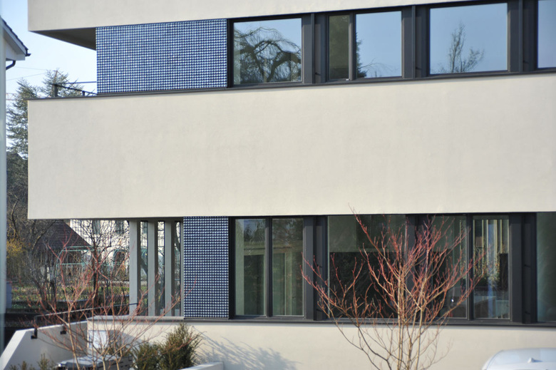 Das ganze Gebäude wurde bis auf den Rohbau rückgebaut und die ungedämmte Betonfassade aussenisoliert und verputzt. Um die Bänderwirkung zu unterstützen und den Charakter der Sechziger zu betonen, wurden die Flächen zwischen den Fenstern mit glasiertem Feinsteinzeugmosaik verkleidet. In den Wohnräumen erzeugen die hellen Kalksteinböden zusammen mit den dunkelgebeizten Küchen eine freundliche und elegante Wohnathmosphäre.
