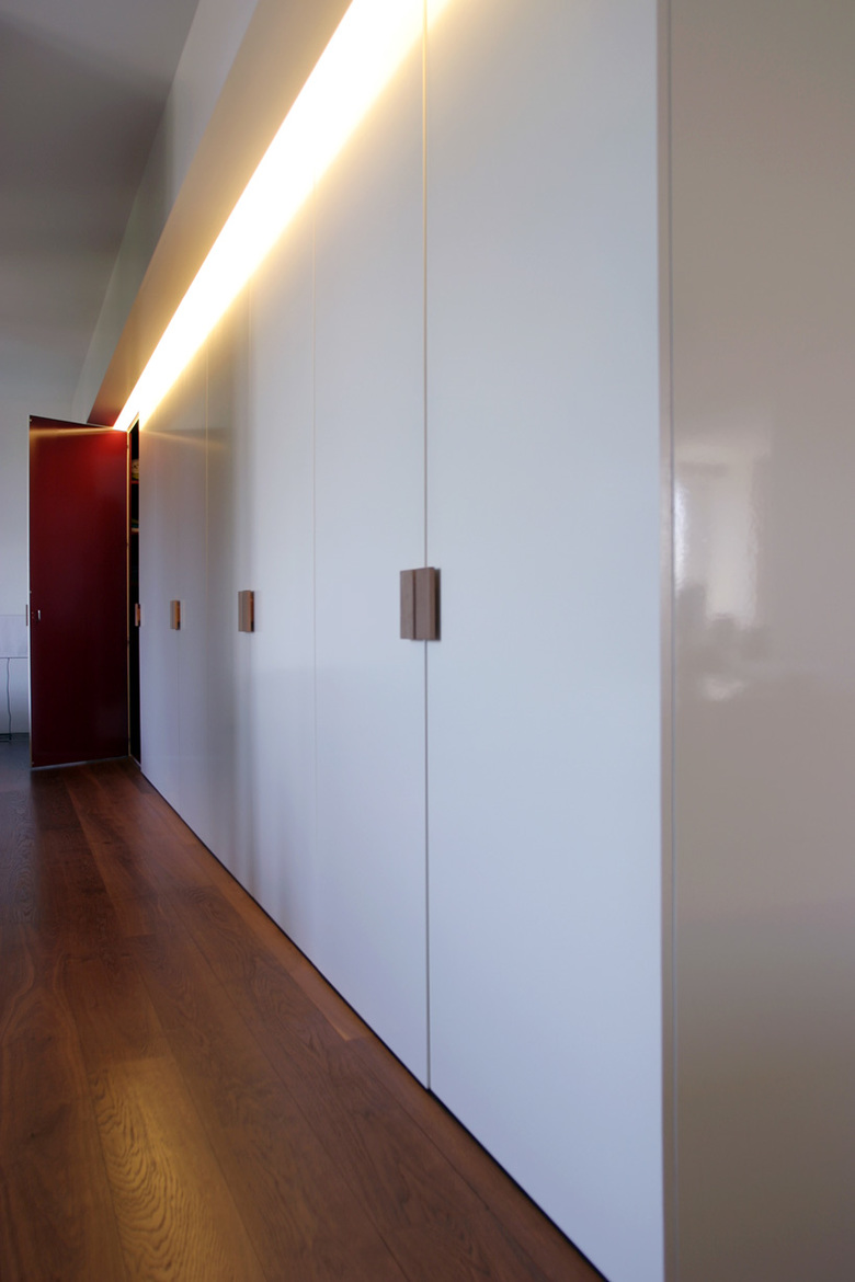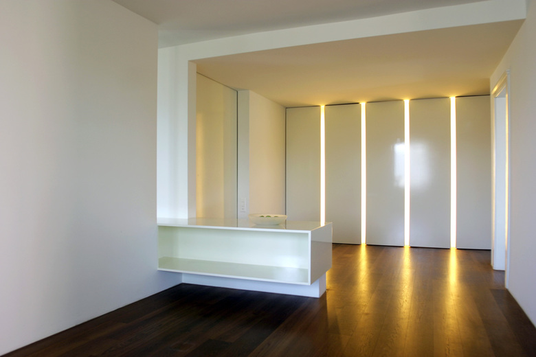 Da schon mehrmals umgebaut worden war und die Anforderungen neu an einen Ein- bis Zweipersonen-haushalt gestellt wurden, konnte auf die ursprüngliche Raumstruktur nicht mehr Rücksicht genommen werden. Die lichtdurchflutete Situation mit einer enormen Aussicht auf weite Teile der Stadt sollte betont werden durch eine Durchlässigkeit der Räume, ein Raumkontinuum. Einzig das intime Badezimmer, eine Art Schatzkammer hinter dem Schlafzimmer, liegt getrennt hinter der getarnten Schranktüre.
