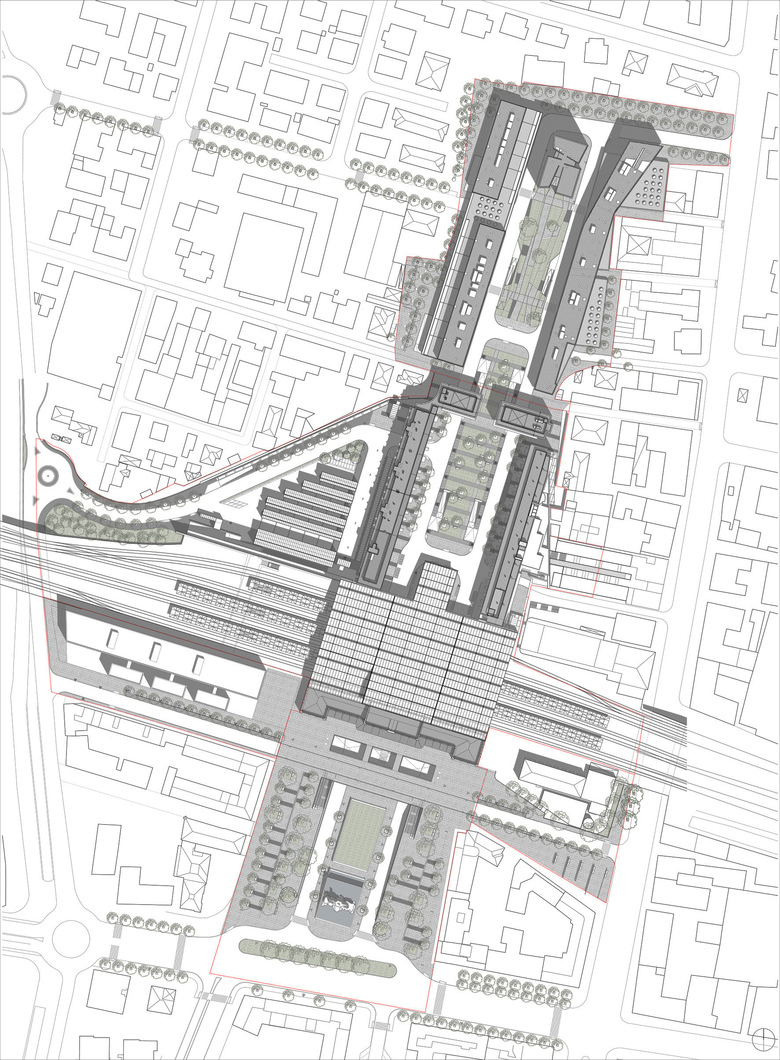 As in so many European cities, in Parma the railway is a major urban barrier, above all in the area near the station, which suffers from a lack of communication between two radically differentiated sectors: one to the south, well connected with the city centre and the areas of new growth by way of a discreetly monumental square, and the other to the north, a disordered, suburbialized neighbourhood full of derelict warehouses and obsolete factories, poorly connected with the central areas. A reappraisal of the railway facilities has provided the opportunity to remodel this area according to the following premises: 1) construction of a new station beneath the tracks that will also ensure ease and clarity of communication between the two sectors; 2) creation of an urban space to the north that will be the continuation of the square in the south (Piazzale Carlo della Chiesa), with an evident centrality, defined by a coherent architecture; 3) construction of a large underground car park and a bus station. 4) laying out of a street system that effectively relates this sector to the city’s general traffic network. The compositional plan is based on imposing a 7% gradient on Piazzale Carlo della Chiesa in order to slope it down to 8.50 m beneath the railway tracks: not only the landscaped central space but also the two lateral roads that give access to the station and link through to the N sector where the continuity of the square is emphatically affirmed by a 270 x 55 m urban space that will generate the transformation of the neighbourhood as a whole. This operation is complemented by an underground car park and a bus station.