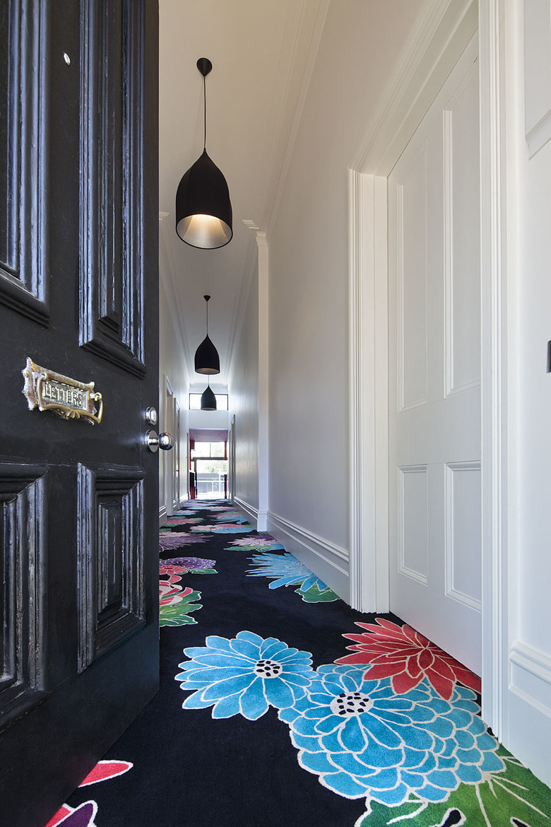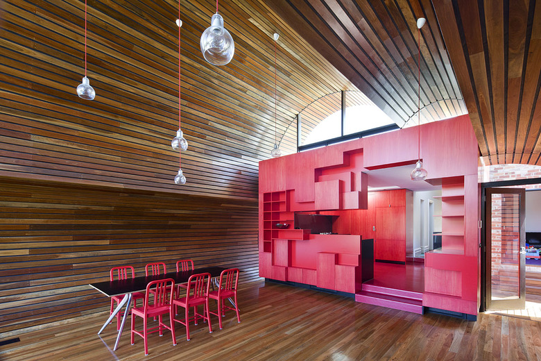 The street facade has been left to demonstrate the clients’ respect for the evolution of the character of the area and the modest street alteration belies the extent of the comprehensive internal renovation work. The spaces within the original structure are largely white in colour, united by exotic floral hallway carpet. This journey through the space is followed by encountering a disintegrated red-coloured ‘box’. This is the kitchen, at the heart of the property, which acts as a bridge linking the major spaces. A cloud-shaped extrusion is the unexpected final space. Following the form of a child-like impression of a cloud it is a playful addition where family and friends can eat and have fun surrounded by the curved form.