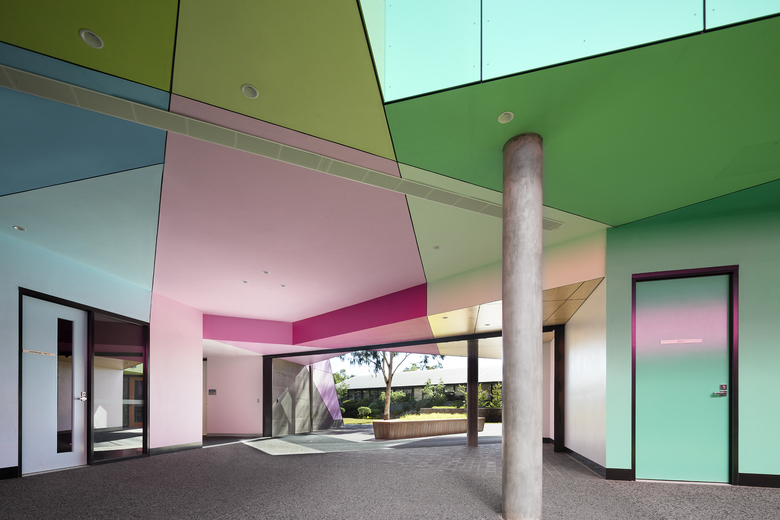 However, rather than adopting a circular or radial pattern dictated by the shape of the plan, we choose to overlay an angular geometry. This geometry was used to define the central courtyards, the light wells and a mosaic of learning spaces. This geometry contrasts and disrupts the building’s circular motif, highlighting key entry points and providing a distinction between the outer world (singular, civic, circular, executed in a muted landscape palate) and the inner world (complex, dynamic, expressive & colourful).