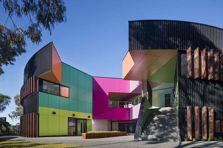 The contrast so evident in this building’s language encapsulates the contemporary pedagogical approaches for a well-rounded education. The circular form is a classical representation of order, rigour, and the certainty of knowledge – the buildings inner world, with its complex mosaic of spaces, amplified by pattern, colour and multiple reflections, represents the uncertainty and complexity of modern life and scientific understanding, and the necessity of the qualities of wonder and imagination to advance and see us through.