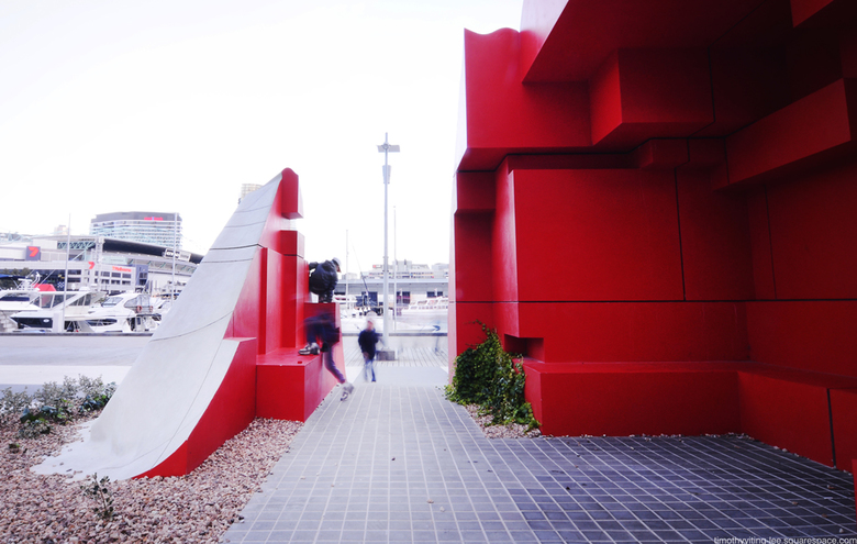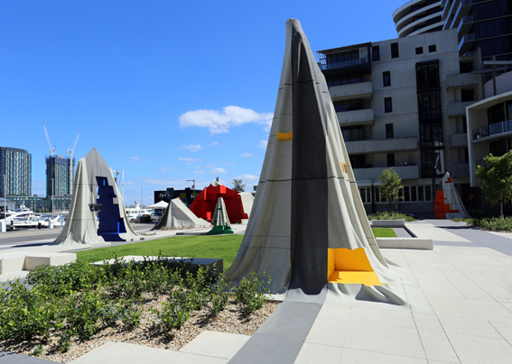 In mid 2012 MCR and MAB started working toward the realization of `Monument Park’ – a space between New Quay Promenade and `The Quays’ apartments. It seemed that this place had to address all the negative perceptions of the docklands. The ambition was to readdress retail, to provide shelter, to engage all ages, be playful, somewhere to sit and be `Art’. The artist Callum Morton’s submission was chosen and the collaboration was further enhanced by the inclusion of the landscape Architect Occulus. The rest of the description of the project is best served by quoting Callum’s `opening’ speech.