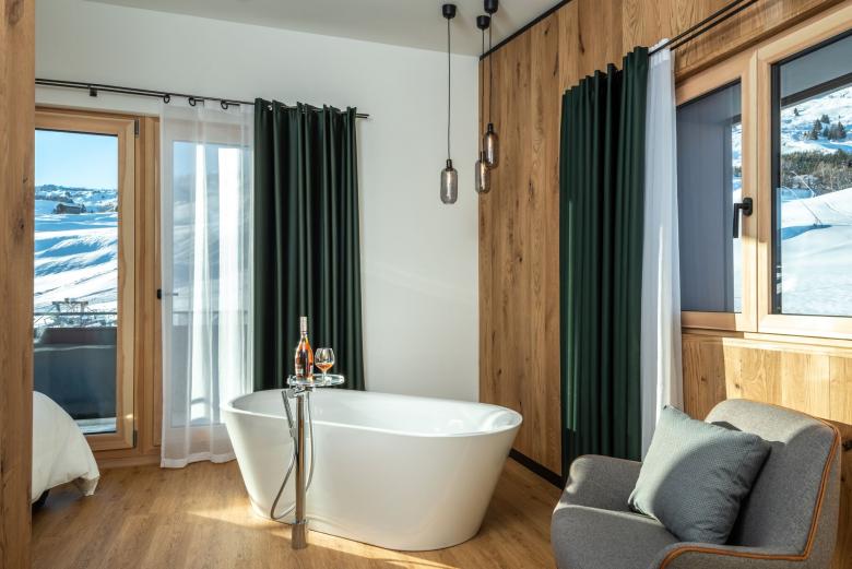 Die Fassade Richtung Skipiste zeigt ein prägnantes Volumen, das sich aus dem homogenen Volumen des Daches heraus entwickelt. Die grossen Fenster der Fassade ermöglichen einen guten Ausblick auf die Skipiste und die umliegende Bergwelt.