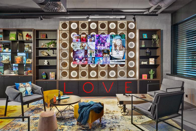 Im Erdgeschoss gehen verschiedene öffentliche Bereiche wie Lobby, Rezeption, Tagungsräume und eine Lounge inklusive Bar als „Open Lobby“ ineinander über. Das Frühstücksbuffet ist als „Grap and Go“ konzipiert. Lange Tische und gemütliche Lounges laden zum Verweilen und Kennenlernen ein.