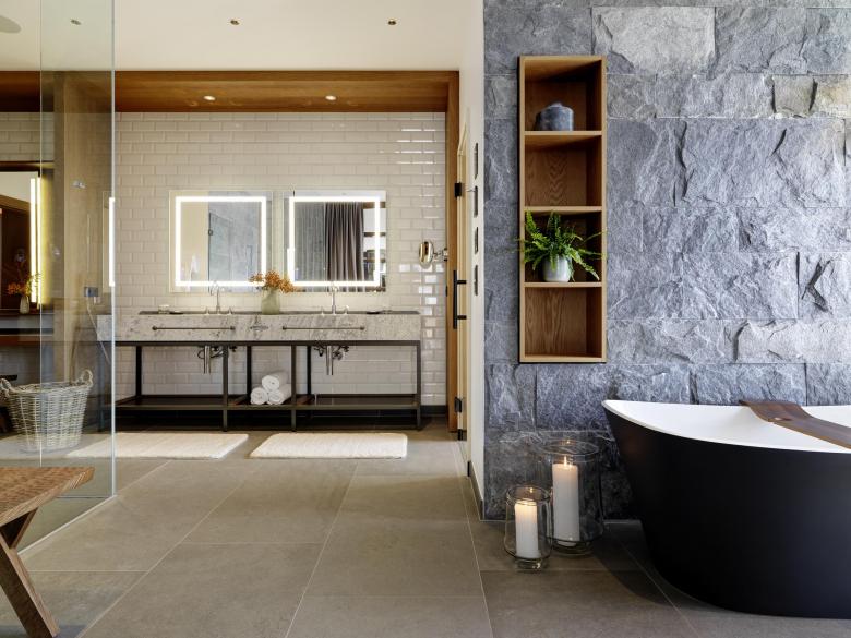 Insgesamt präsentieren sich die Räume und Bäder sehr offen und grosszügig. Hochwertige Materialien wie Eichenböden und ausgesuchter Naturstein verleihen dem neuen Interieur eine edle und zugleich frische Erscheinung. Die natürliche Struktur der Materialien sorgt für eine lebendige Haptik, die mit traditioneller Handwerkskunst kombiniert und durch erdige Naturfarben und zeitlos gehaltenes Mobiliar abgerundet wird.