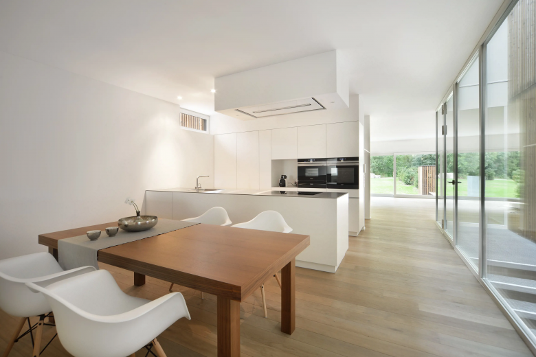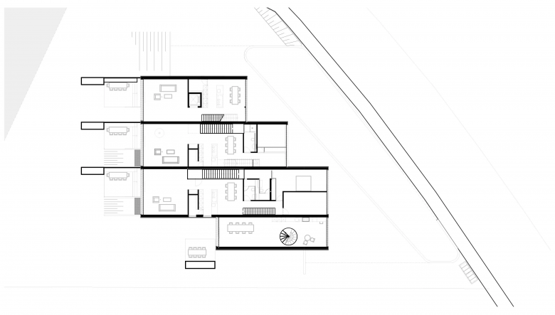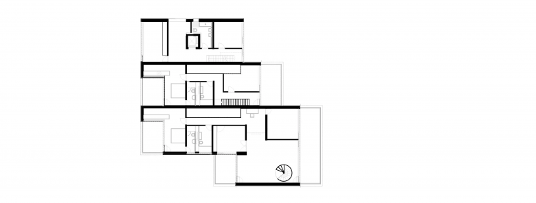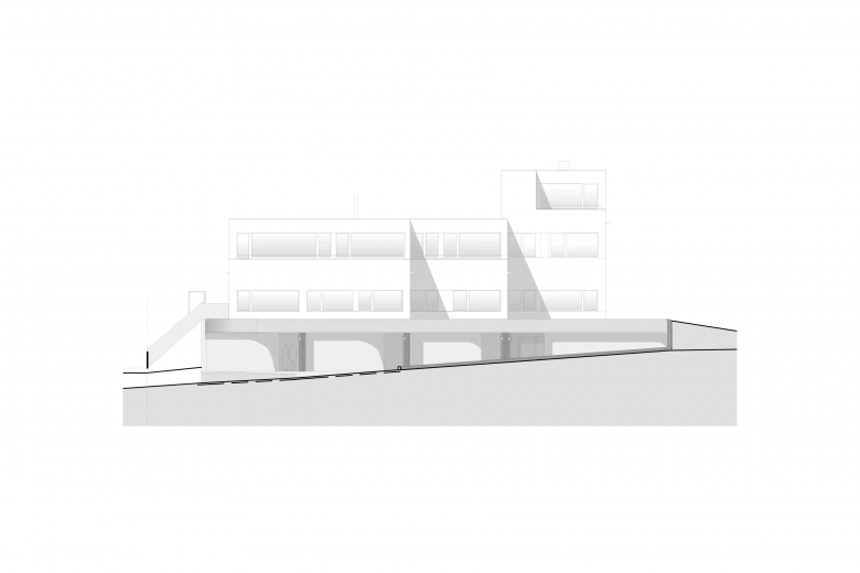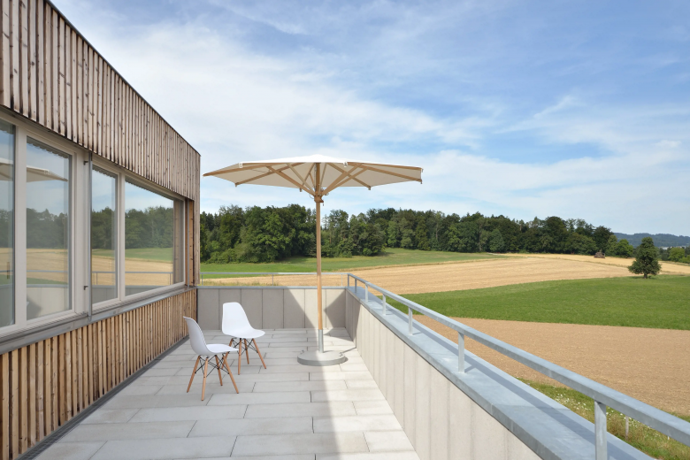 Angrenzend an die Natur anstelle einer ehemaligen Villa nimmt das Mehrfamilienhaus vier unterschiedlich grosse Wohnungen auf. Seine vertikale Holzverschalung verleiht ihm eine pavillonähnliche Ausstrahlung, wodurch es sich harmonisch in seine Umgebung einfügt. Die individuellen Eingänge und Garagen kommen auf einem Hof zusammen. Jede Wohnung ordnet sich um einen gedeckten sowie um einen offenen Lichthof an.