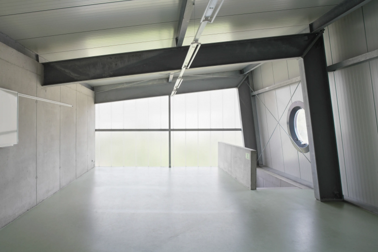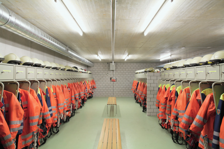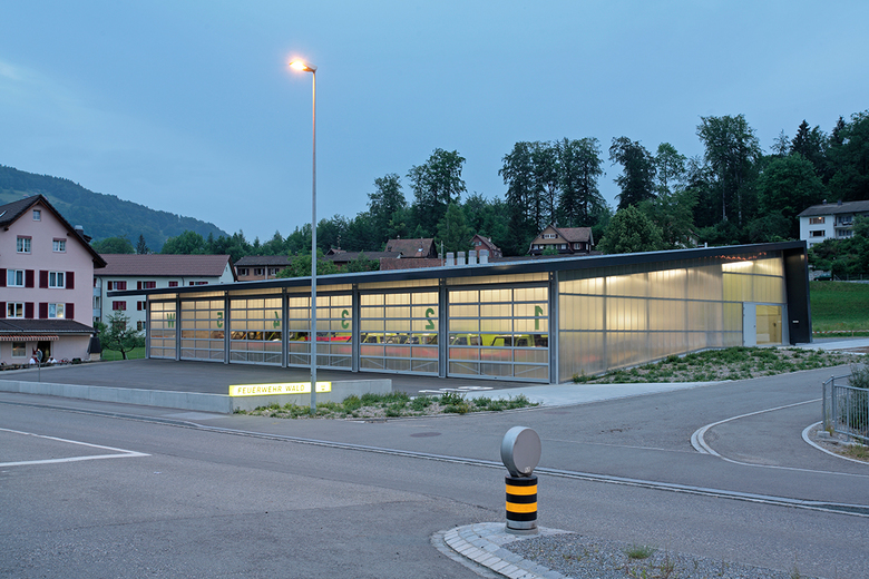 Die Orientierung des Feuerwehrdepots unterstreicht einerseits die Wichtigkeit dieser Einrichtung. Andererseits bewerkstelligt sie den Lärmschutz der dahinterliegenden Wohnbebauung gegenüber der Strasse und der ausrückenden Feuerwehr. Schnelle Erreichbarkeit und Blickkontakte zwischen verschiedenen Räumen innerhalb der Einrichtung sind wesentliche Entwurfsanforderungen. Die Fassaden aus transluzenten Stegplatten bieten tagsüber gute Belichtung und lassen nachts die seitlichen Fassaden und Tore im Einsatzfall zur Strasse hin wie Laternen leuchten – ein Alarm der subtilen Art.