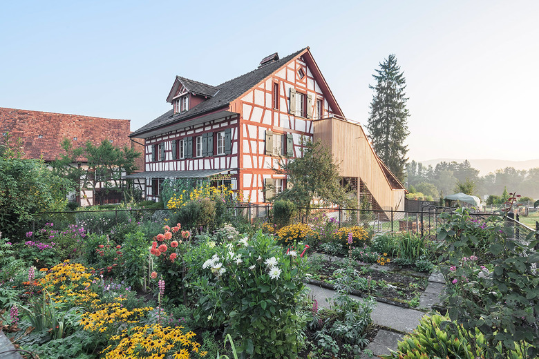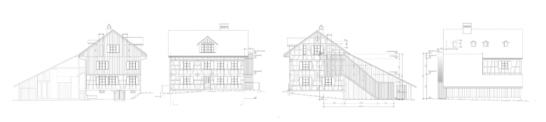 Im Zuge der Umnutzung des Büros zu einer Kleinwohnung wird die Erschliessung des Dachgeschosses auf die Ostseite verlegt, damit die Zugänge der zwei Parteien komplett getrennt sind. Die Treppe ist so ausgestaltet, dass auf dem darüberliegenden Dach ein Aussenraum für die Wohnung entsteht. Die leichte Stahlkonstruktion mit einer luftigen und zurückhaltenden Holzverkleidung konkurrenziert die schöne Riegelfassade und haltet die Eingriffe im Bestand gering.