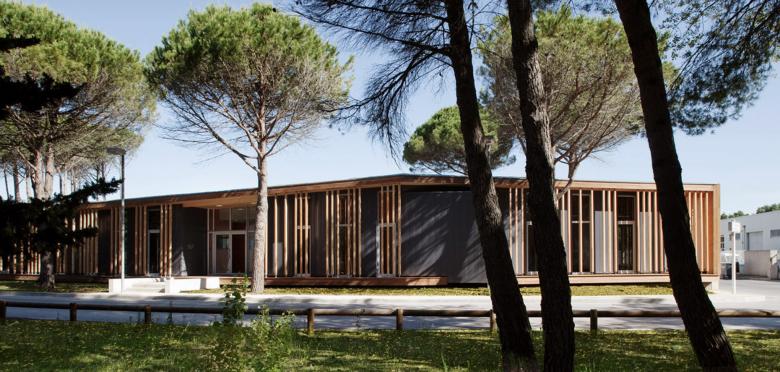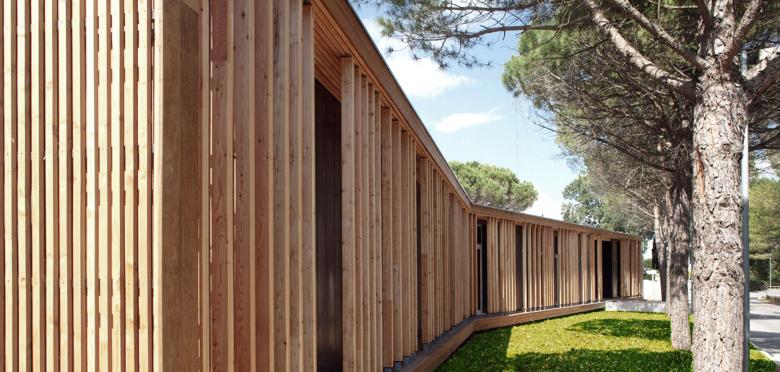 Ainsi une attention particulière est apportée à son insertion dans le site. Il est donc conçu comme une ligne topographique dessinée par un seul et même matériaux (du bois) lui offrant une unité spatiale mais aussi visuelle. C’est sous cette ligne de paysage constituée par une toiture plate que les entités du programme viennent prendre place. Elle a été pensée afin de mettre en valeur le paysage environnant tout en identifiant et protégeant des espaces extérieurs exploitables. Conçu dans la continuité des masses végétales environnantes ces limites atténuent l’incidence d’un nouveau bâtiment dans le paysage et créent un filtre visuel et auditif préservant les espaces de travail des nuisances extérieures. Ainsi, le bâtiment se compose d’un pli développant deux façades latérales constituée de manière homogène. Le projet propose une mise en retraits des façades vitrées et la mise en place de brise soleil en bois reliant les entités hautes et basses du pli. Ce dispositif permet de créer une épaisseur à la façade qui génère une protection solaire tout en pouvant profiter grâce à de larges ouvertures, d’une liaison directe entre l’intérieur et l’extérieur. Le dispositif permet également une continuité spatiale et visuelle tout en répondant aux contraires climatiques propre à la méditerranée. Le projet est entièrement construit en bois. C’est un choix environnemental que nous avons fait en travaillant avec des essences de pins locaux, mais aussi afin d’assurer une simplicité technique, constructive et fonctionnelle.