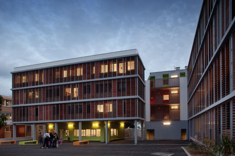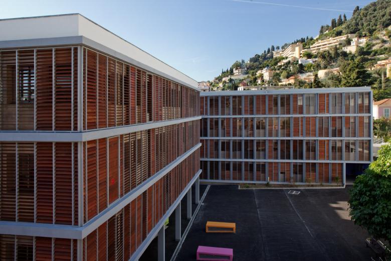 Une cohérence au site en respect d’un environnement. De par ses diverses interventions mais également une écriture architecturale homogène, le projet donne au Lycée une image spécifique et inscrite dans le site afin de ne pas nuire aux bâtiments environnants et de ne pas dégrader leurs vues existantes. Au contraire l’implantation de nouveaux bâtiments cherche à protéger et contenir les éventuelles nuisances induites par le lycée : nuisances sonores d’une part mais également visuelles, d’où la création d’un « bâtiment écran » au Sud de la parcelle afin de filtrer les activités. Le travail spécifique sur cet écran, mais aussi la constitution d’une nouvelle peau en persiennes bois visaient deux objectifs majeurs. Le premier décrit précédemment, mettre en place une unité visuelle, mais aussi assurer un confort thermique lié à la protection solaire. De même des toitures végétalisées ont été installées sur les bâtiments toujours dans ce double objectif de constitution d’une unité, mais aussi de ne pas nuire visuellement à l’environnement, et ensuite de répondre à une amélioration thermique du bâti existant.