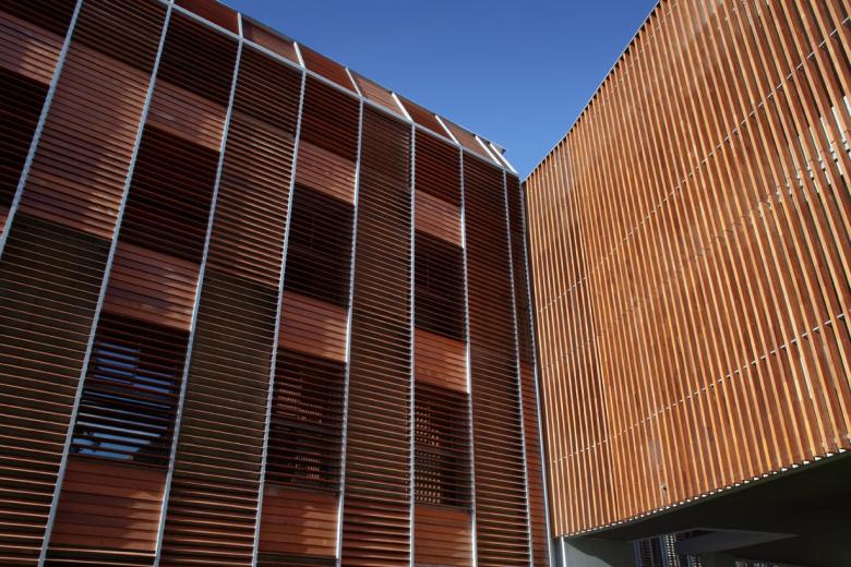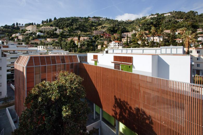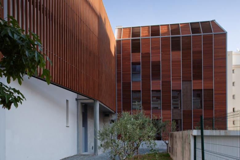 Ainsi, fort de cette contradiction, notre objectif premier a été celui de constituer une unité au site que nous avons retranscrit par une continuité spatiale - de par la nécessaire connexion des bâtiments entre eux, et ceci malgré les fortes différences altimétriques d’implantation - mais aussi continuité visuelle, afin d’offrir une véritable identité à cet établissement. Une peau unique et identitaire constituée de brise soleil en bois, vient tel un voile protecteur envelopper à la fois les bâtiments existants et les nouvelles constructions.
