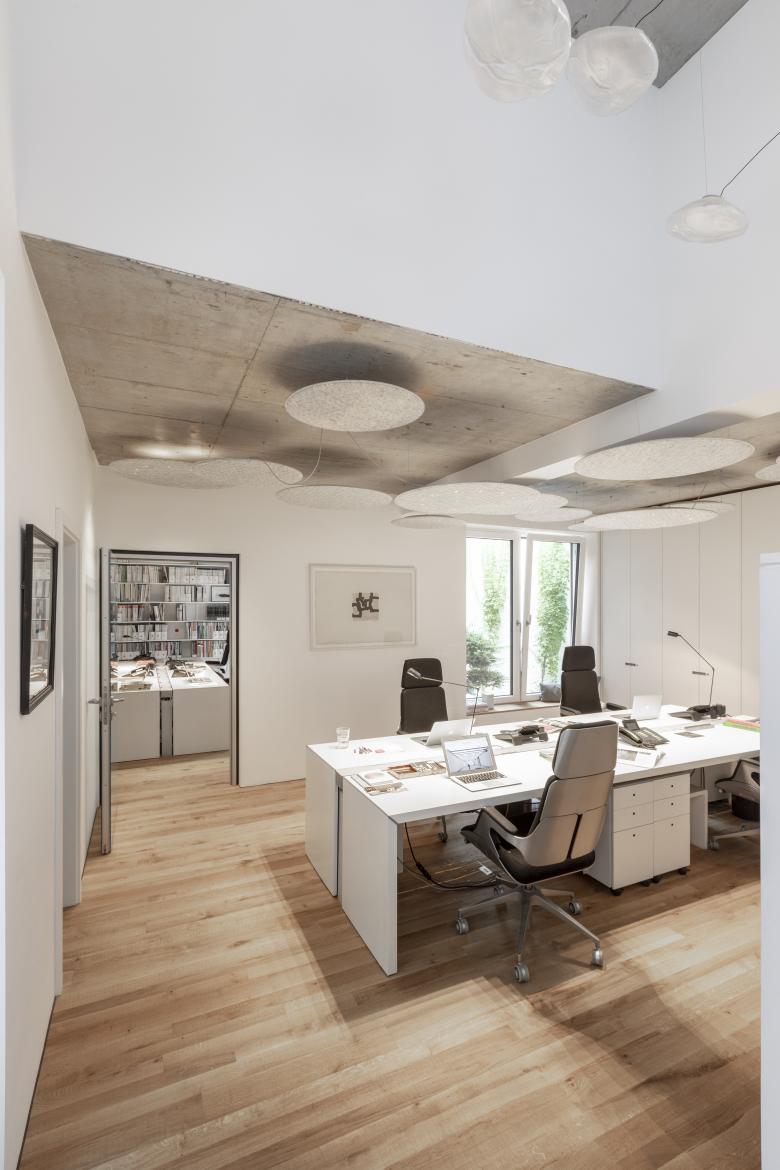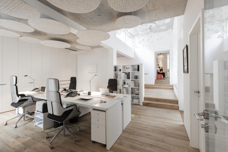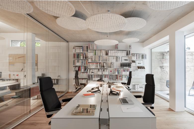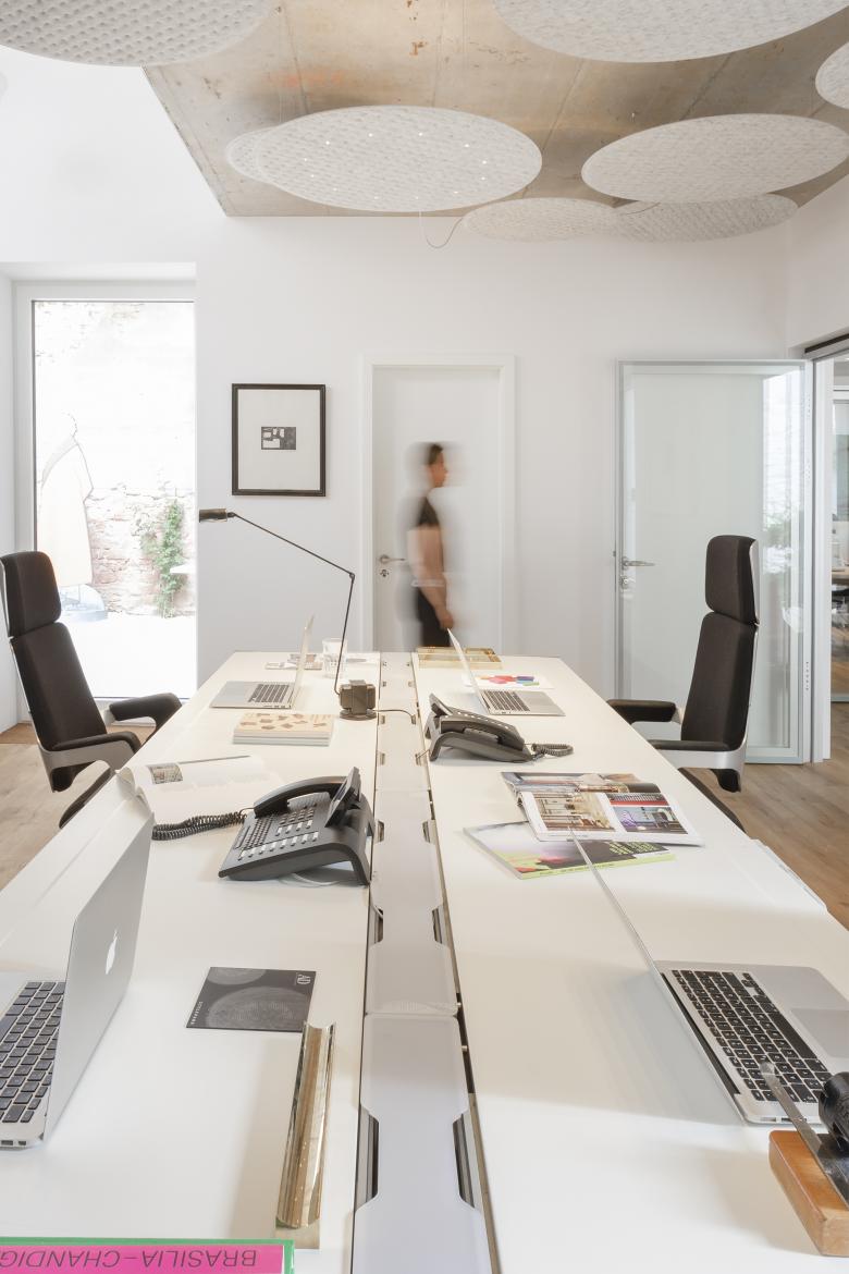 Denkmalgeschützt und parkartig liegt die Anlage um die Kirche Sankt Peter wie eine kleine Oase mitten in der Frankfurter Innenstadt. Von hier aus gut sichtbar, „füllt“ der Neubau für die Architektur- und Designplattform Stylepark den Hinterhof eines bestehenden Wohn- und Geschäftshauses. Dabei bindet er eine historische Friedhofsmauer in die Fassade ein und baut mit seiner geschichteten Ziegeloptik gekonnt eine Brücke zur Gegenwart. „Im Konzeptgedanken stand nicht eine Abgrenzung im Vordergrund, sondern das Weiterbauen und die Akzentuierung der verschiedenen vorhandenen Zeitschichten“, so die Architekten von NKBAK, die das Gebäude mit viel Feingefühl gestalteten. Im Erdgeschoss, in dem sich die Büroräume von Stylepark befinden, haben die Architekten zwei Innenhöfe vorgesehen. Sie dienen bei angenehmem Wetter als Aufenthaltsräume im Freien und ermöglichen gleichzeitig vielfältige Blickbeziehungen. Im Inneren gehen die Mitarbeiter von Stylepark in drei offen gestalteten Bereichen ihrer Arbeit nach. Das Rossoacoustic Pad System und Lighting Pads von Nimbus sorgen hier für Behaglichkeit, indem sie eine optimale Beleuchtungs- und Klangsituation schaffen. Damit setzten sie das Gestaltungsprinzip des Verbindens auch im Kleinen fort: Sie vereinen die Qualitäten eines effizienten Schallabsorbers mit einer brillanten Lichtwirkung. Definierte Raumzonen werden von ihnen bei Bedarf in atmosphärisches Licht getaucht. Gleichzeitig verleihen sie den Sichtbetondecken eine zusätzliche Ebene und Struktur – damit wirken sie als völlig eigenständiges, gestalterisches Element. „Die sehen gut aus, machen prima Licht und sind dabei auch noch akustisch wirksam“ begeistern sich Nicole Kerstin Berganski und Andreas Krawczyk von NKBAK. Franziska Michaelis und Robert Volhard, Vorstände von Stylepark ergänzen: "Die Lighting Pads von Nimbus sind sowohl gestalterisch als auch akustisch die ideale Lösung für unser neues Büro. Sie ergänzen als skulpturales Element die minimalistische Raumarchitektur ohne aufdringlich zu wirken und verbinden Licht und Akustik in perfekter Weise."