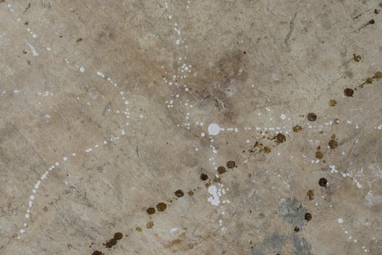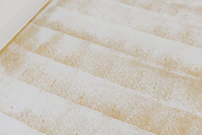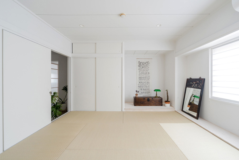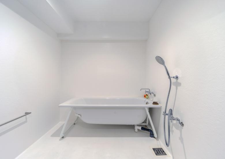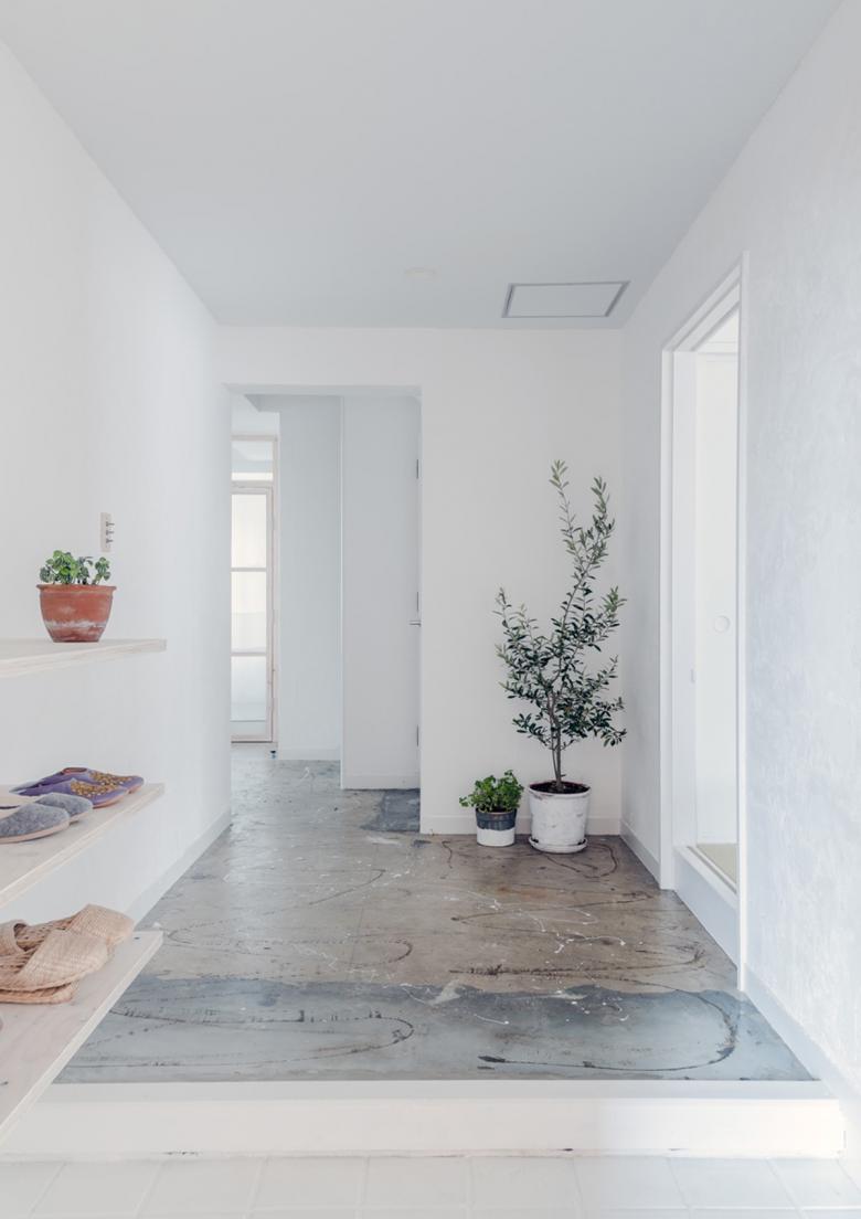 カーペーットを剥がした接着剤の跡をぼかすように、白い塗料をドロッピングした土足空間でもあり上履き空間でもある大らかな空間。