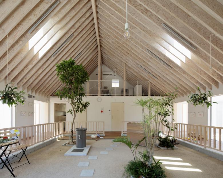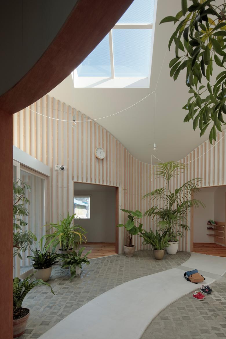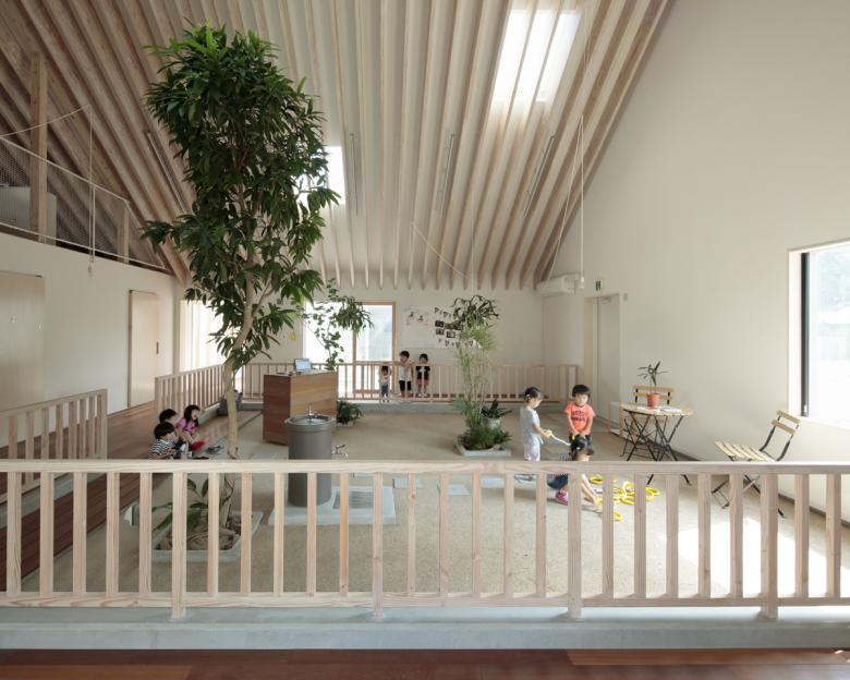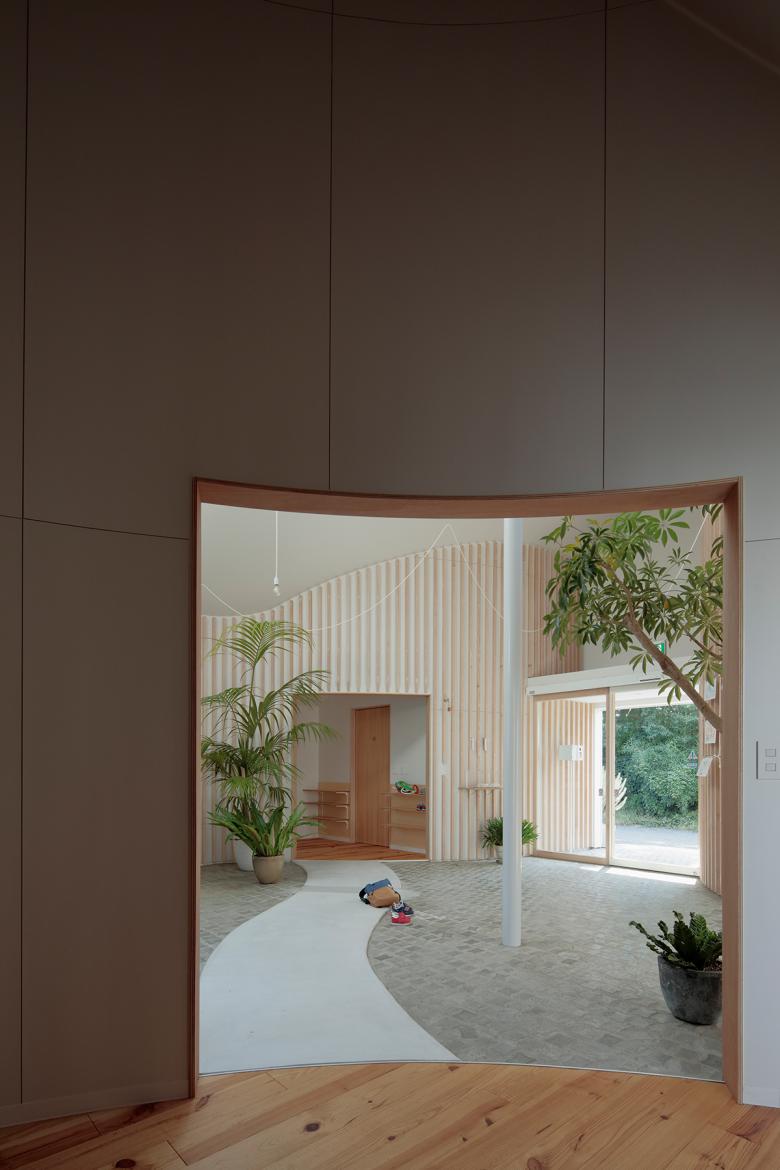 内部では、幼稚園とは違い保育園という性質上、セキュリティが重要視されるが、本園に存在する縁側を踏襲し、エントランス棟内部に配置している。雨の日であっても園児は駆け回ることができ、そして朝の混雑時も余裕をもって受け入れることができるようになる。また、渡り廊下も同じように設け、1歳児・2歳児共に、渡り廊下を介して、それぞれの教室に向かうこととなる。既存の「縁側」「渡り廊下」といった当たり前、その当たり前は学園の顔であり、卒園生の思い出でもある。