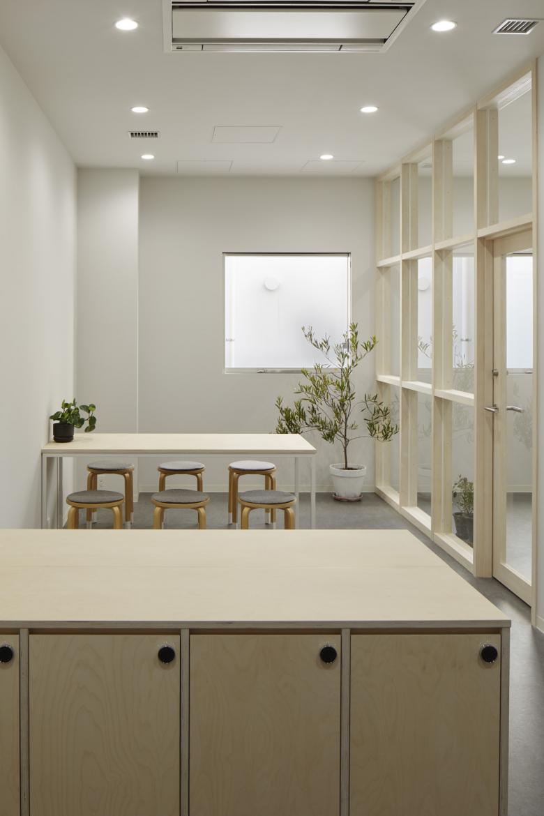 住宅では職場への動線を確保しながらも、仕事から遮断した平面計画とし、大きな外部吹き抜けを設けることで「外に閉じながら内に開き」、住宅としての機能・性能を保つこととしている。