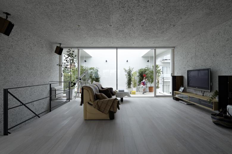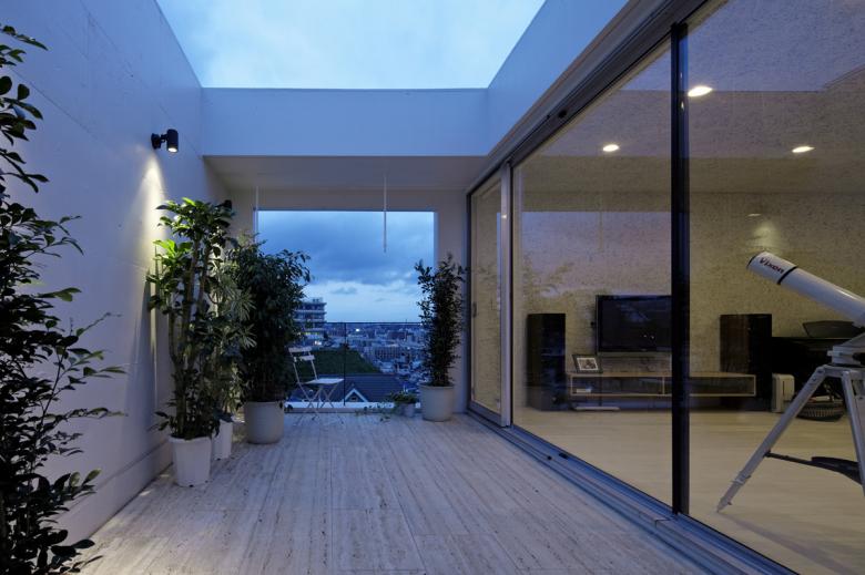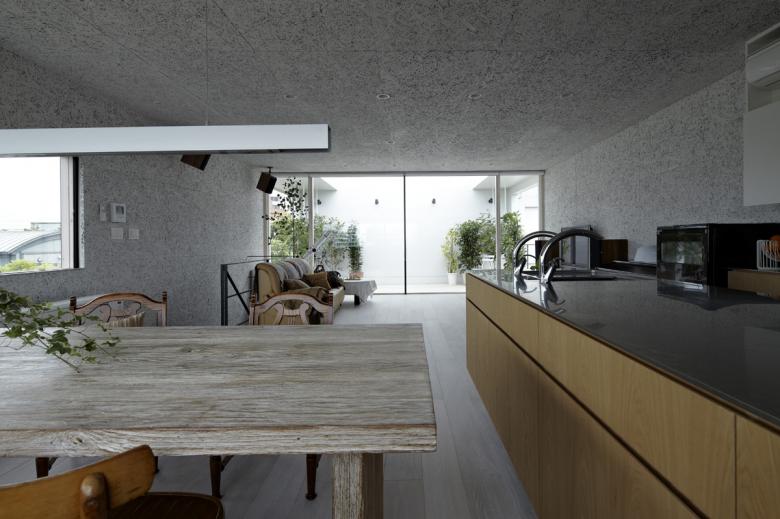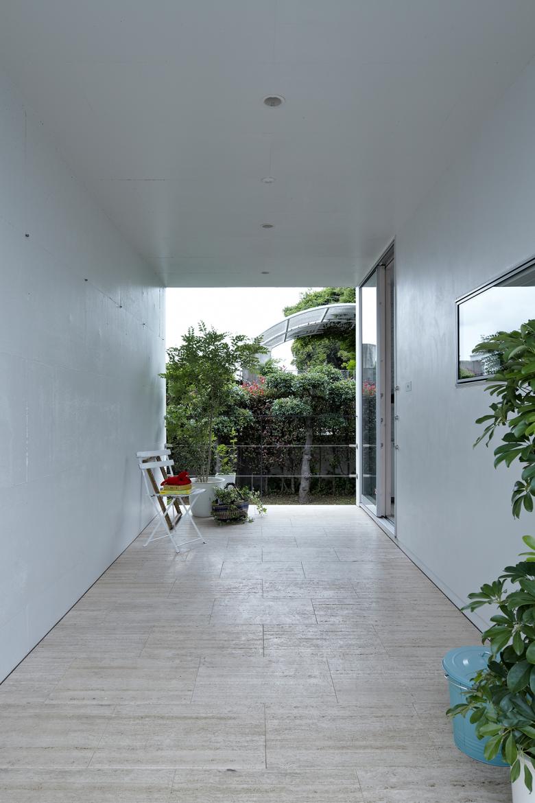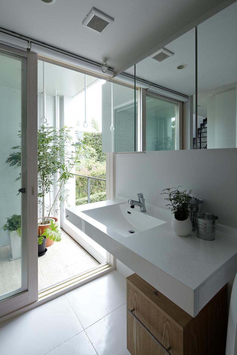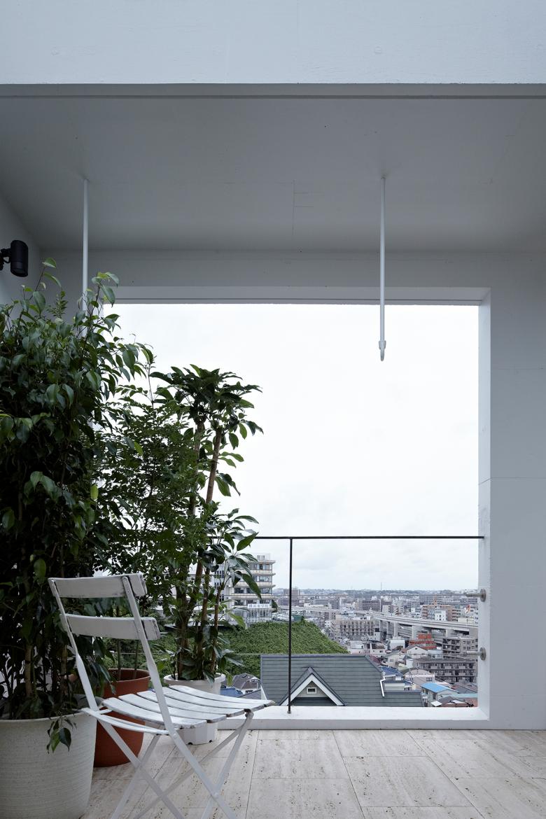 まず、視線の配慮を考慮し、壁で囲いながらもタテ・ヨコに大きな開口を開け、必要な採光と通風、眺望を得ている。