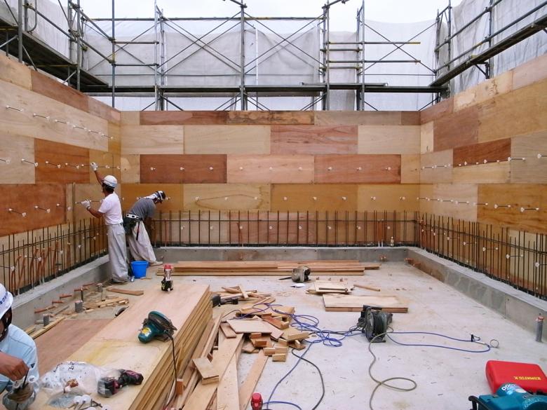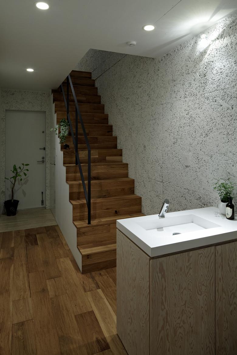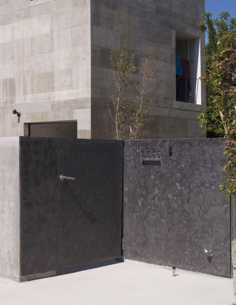 そして、周囲の良好な環境に馴染ませる目的で、古くからある山手のBluff Load(石積擁壁)の様子を建物の外壁に抽象的に表現する事を目的とし、一般的には嫌がられるコンクリート型枠からの灰汁を自然発生させ、赤・白・茶・黄とコンクリートに転写し、よりオーガニックな仕上げを施している。