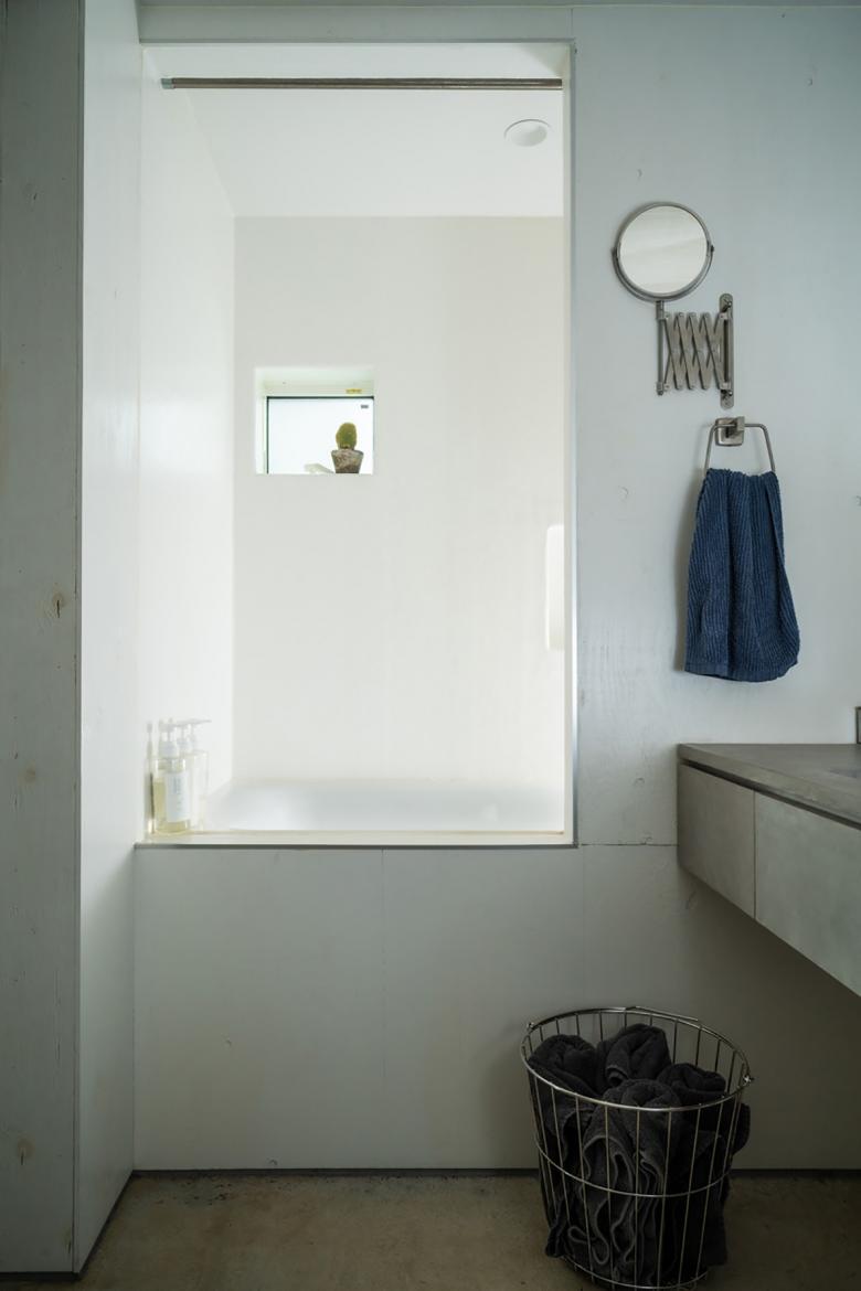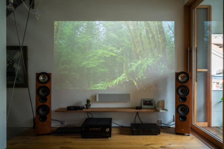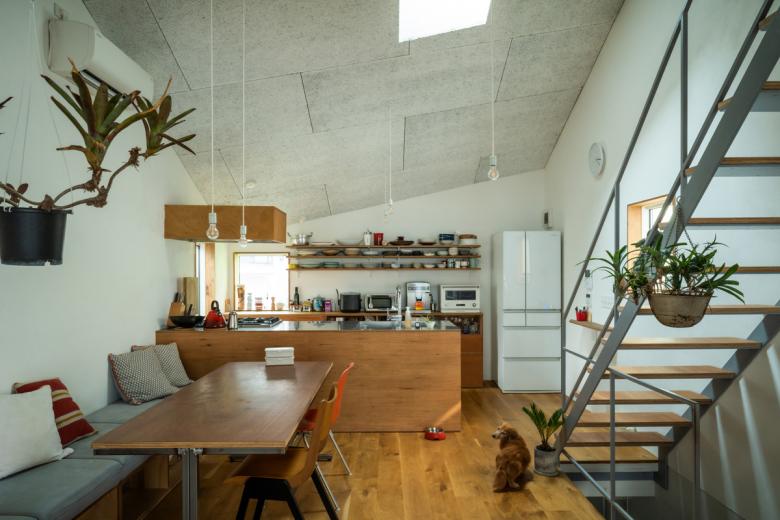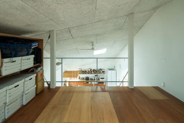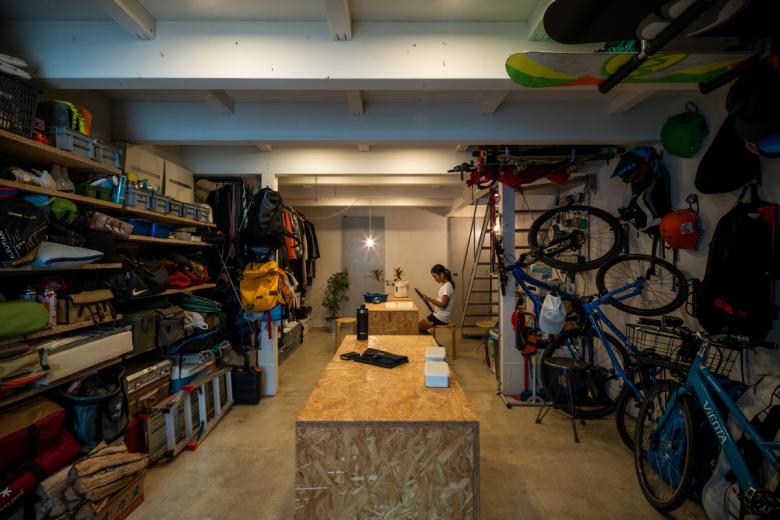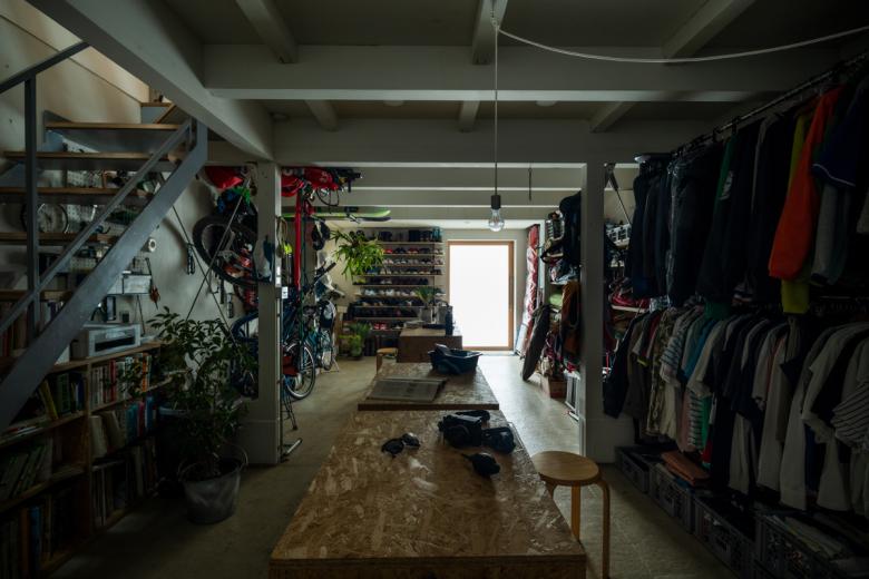 1階部分は、エントランスホールのような、倉庫のような、趣味室のような、二つ目のリビングのようなスクエアな空間があり、ここには趣味のもの、仕事のもの、衣類などミックスされながらも、それなりのルールを保ちながら収納されている。住宅密集地の中で、大らかな家族の大らかな暮らしは、少しの工夫と成熟したルールの中で、日々送られることとなる。