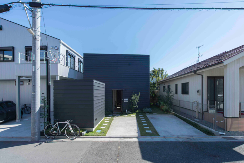まず、建物を平面的に変形させ、残された隙間(スキマ)に、外構の庭・駐車スペース・手洗い場を生み出す。