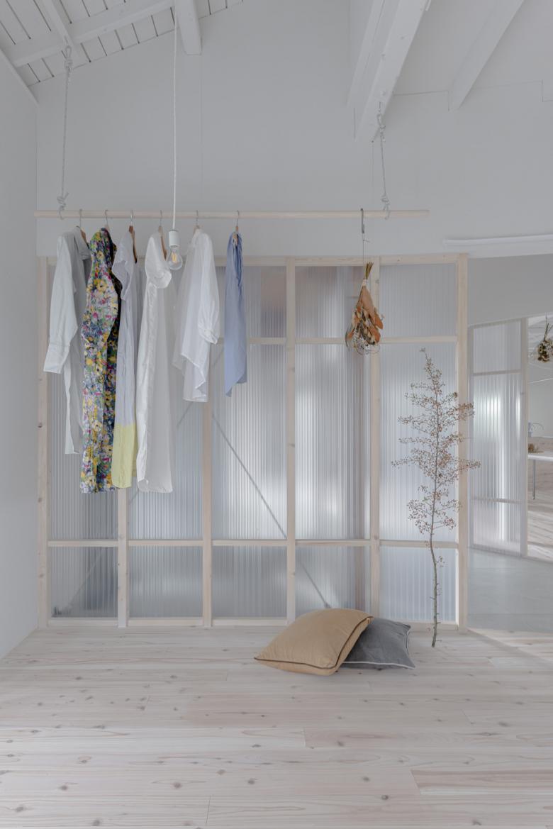建物は昔に作られた一間モジュールのいわゆる一般的な構造であるが、外部のあぜ道(Polku)のように規則性があるようでルーズな通路を内部で横断させ、既存の構造を感じさせない自由な空間としている。