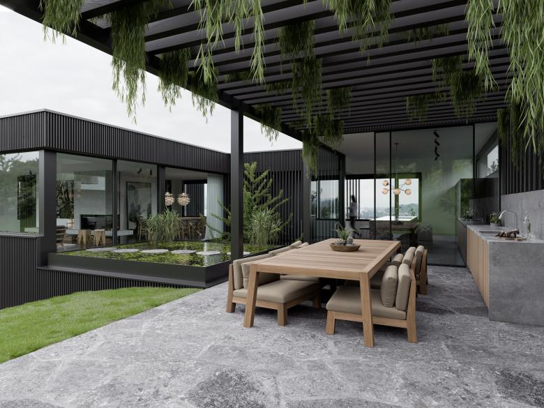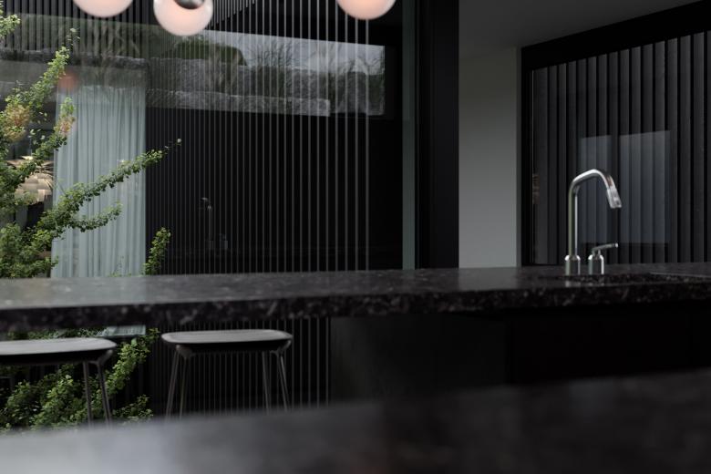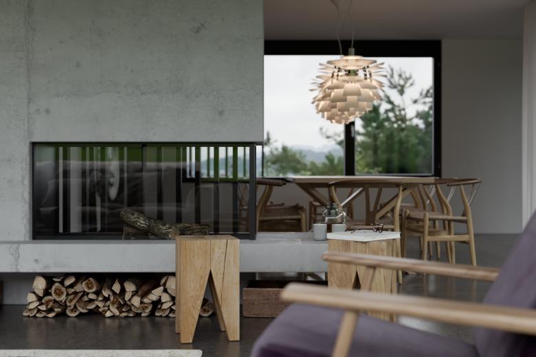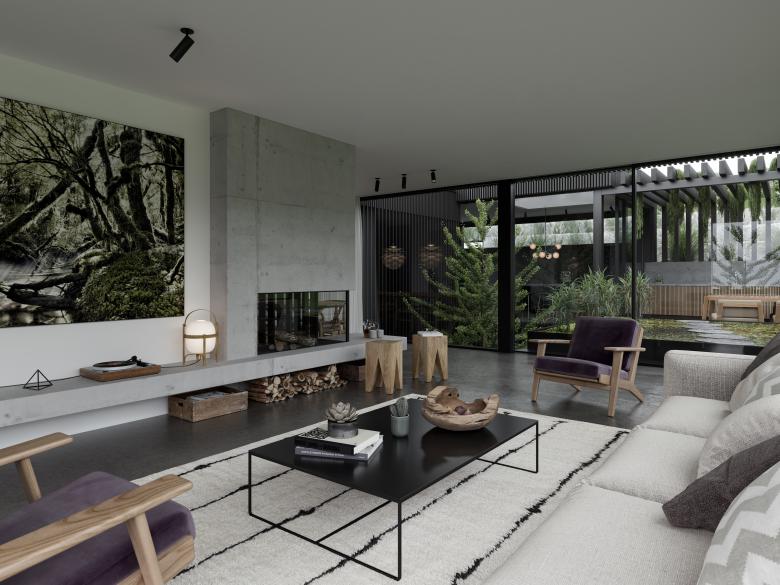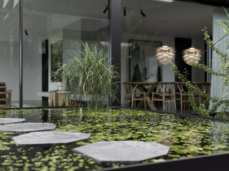 Auf einem Grundstück an steiler Hanglage und mit diversen Einschränkungen wie Aussichtsschutz, Bauverbotszonen und maximaler Gebäudehöhe soll ein Einfamilienhaus für eine vierköpfige Familie geplant werden. Prägende Faktoren für den Entwurf waren die prächtige Aussicht auf den Zürichsee respektive die Glarner Alpen, sowie Themen der Belichtung und Orientierung. Entstanden ist ein lichtdurchflutetes, in den Hang eingeschobenes Gebäude mit einem zentralen Lichthof, mit spannenden Sichtbeziehungen zwischen Innen- und Aussenräumen und zwischen den verschiedenen Wohnzonen.