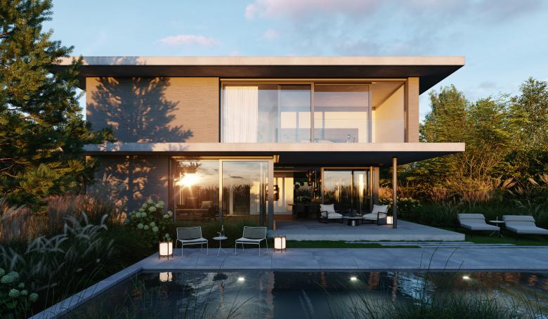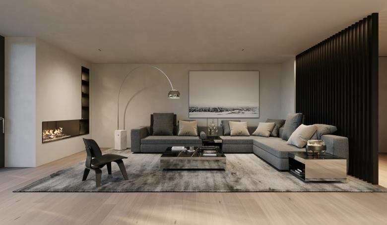 Grosszügige offene Räume, eine starke visuelle Verbindung des Innenraums mit dem Garten und Poolbereich, sowie ein zweigeschossiger Essbereich mit Bezug zur Galerie im Obergeschoss, charakterisieren den Entwurf dieser Villa oberhalb des Zürichsees.