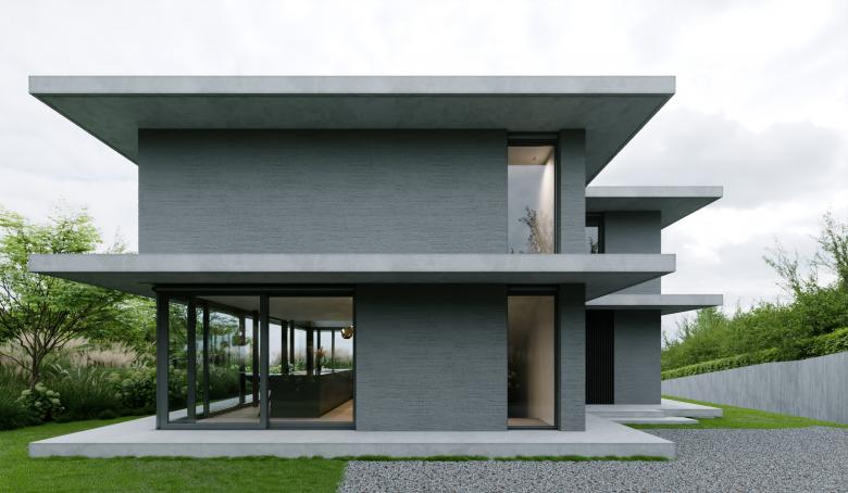 Von aussen zeigt sich das Haus in zurückhaltender Eleganz. Umlaufende Vordächer aus Sichtbeton vermitteln zwischen Innen- und Aussenraum und kontrastieren mit der dunkelgrauen Putzfassade.