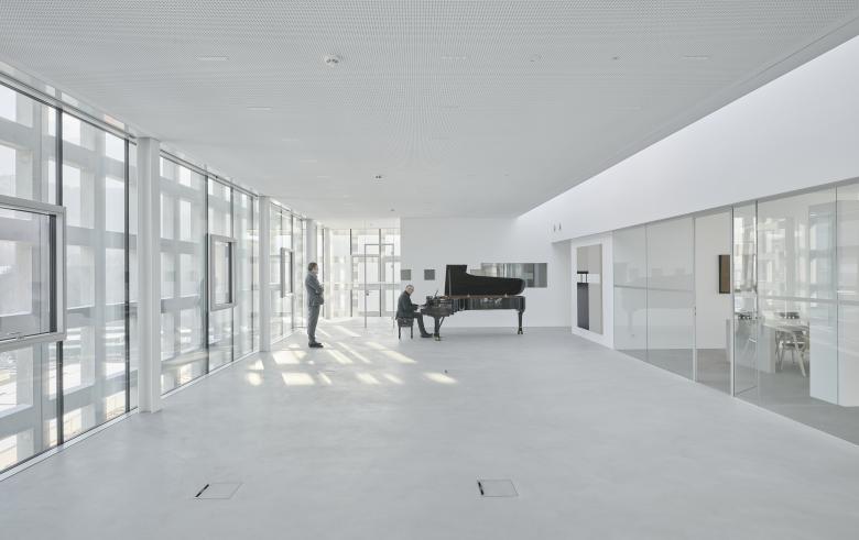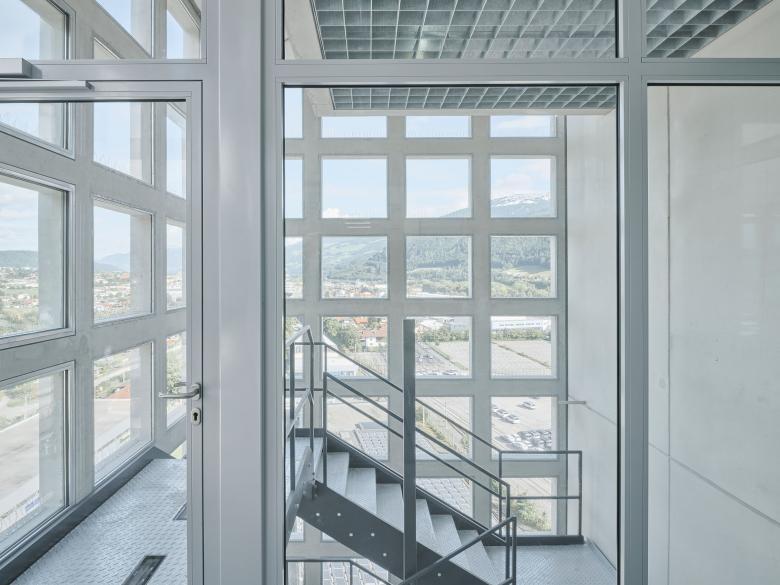 Im „Kunstraum“ auf 45m Höhe ist die Weite des umgebenden Panoramas spürbar, zugleich umschließt die dem Glaskubus vorgeblendete Betonrasterfassade die Besucher in einer „eigenen Welt“ und lässt die Schwere des darunter liegenden Betonbaus erahnen.