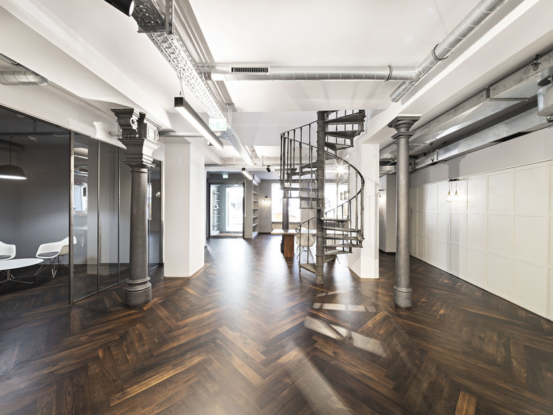 Sanierung und Revitalisierung Prannerstraße 11. Das 1947 wiederaufgebaute Gebäude – Teil des Münchner Altstadtensembles – erfährt eine umfängliche Sanierung mit Erneuerung der Haustechnik. Im Erdgeschoss und im ersten Obergeschoss gestaltet Oliv Architekten repräsentative Büroflächen. Die ehemaligen Räume einer Bank verwandeln sich in ein Architekturbüro. Stilprägende Materialien sind dunkles Holz, roher Stahl und Glas. Die bauzeitlichen Eisensäulen werden durch die Freilegung der Decke in Szene gesetzt.