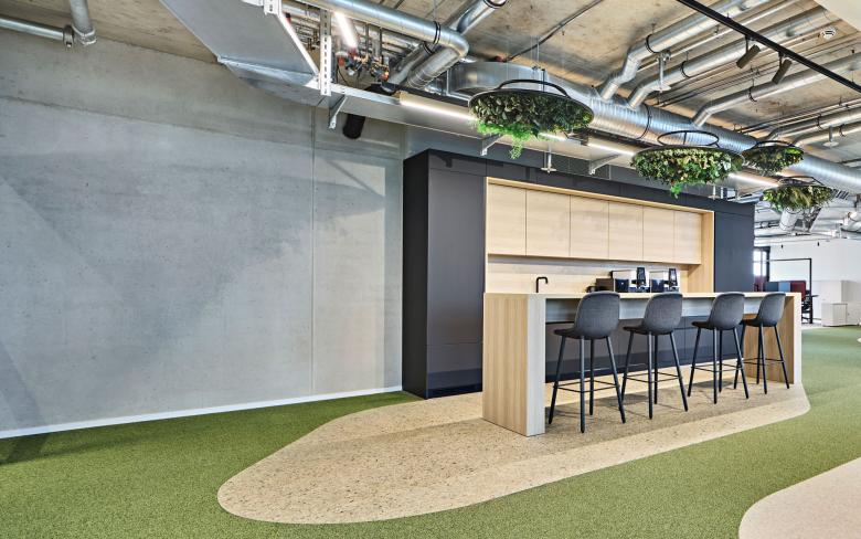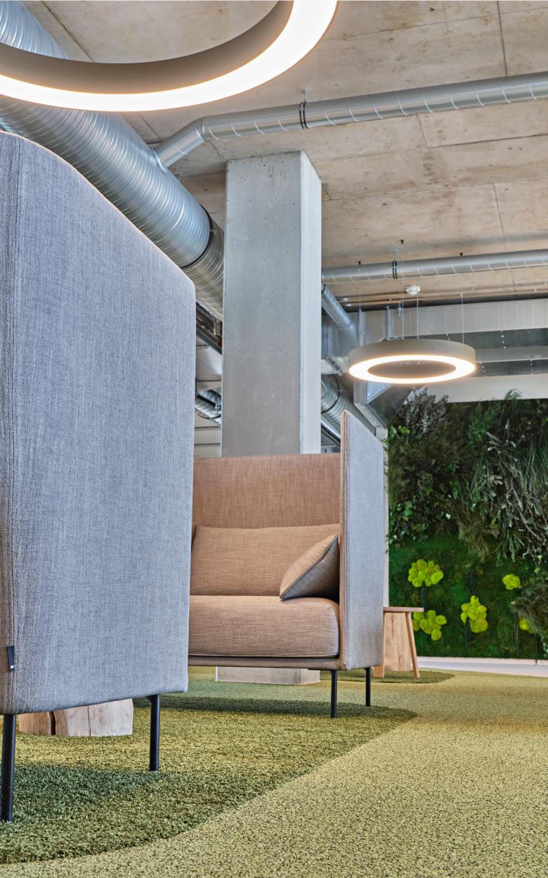 Ein grünes Band mäandert als Flur- und Kommunikationszone durch die Fläche. Weiche Kurven strukturieren den Raum, ähnlich einer Waldlandschaft mit Lichtungen, und verbinden offene und getrennte Büros. Vertikale Element zonieren den Raum in der zweiten Dimension und schaffen Rückzugsräume.