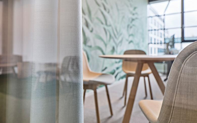 Die offenen Arbeitsbereiche und Wechselarbeitsplätze sind geprägt durch helle Farben. Niedrige Möblierung, Erdtöne und Textil dominieren die Open Space Bereiche und charakterisieren diese unter anderem durch die buschige Bepflanzung und moderne Arbeitsplätze.