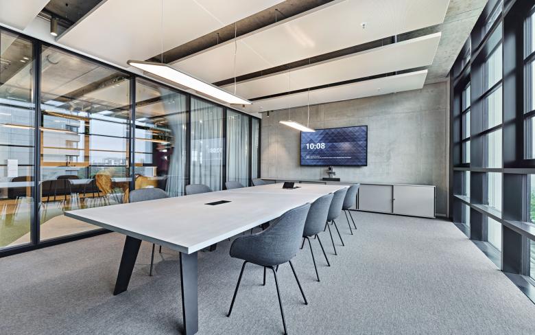 Idyllisch, ökologisch und vielfältig sind die Eigenschaften des großen Konferenzraums und Showrooms. Ein maßgefertigter Tisch aus ungesäumtem Massivholz mit großen Metallrädern ist das Herzstück des Bereichs. Der Bodenbelag aus Almheu unterstreicht das Thema Natur und Land.