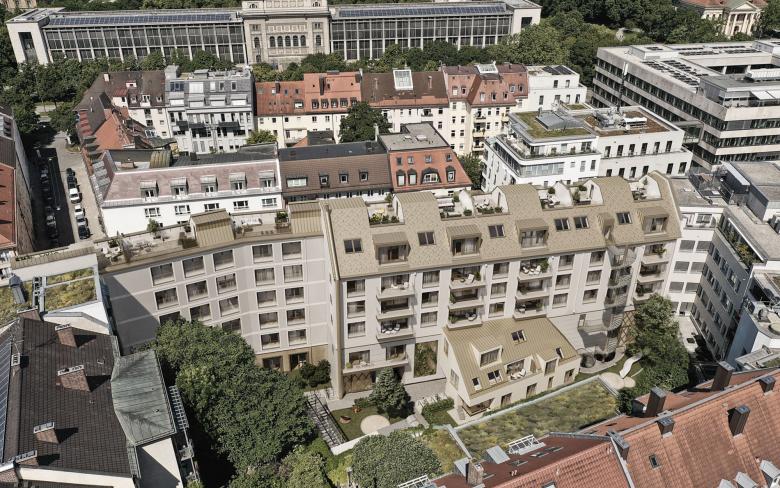 Revitalisierung der Gewerbeimmobilie Seitzstraße 16 im Münchner Stadtteil Lehel. Die Premiumlage in der Nähe des Englischen Gartens und des Hofgartens bietet sich für Wohnungsbau an. Die Bestandsstruktur der beiden postmodernen Gebäudeteile aus dem Jahr 1988 ist in höchstem Maß flexibel, und erlaubt eine freie Grundrissgestaltung. Durch Rückbau und Neubau von Teilen des Hauptgebäudes wird die monolithische Wirkung des Bestands aufgelöst und bildet infolgedessen ein harmonisches Gesamtbild mit der Nachbarbebauung. Begrünte Fassaden, ein Skydeck und eine avantgardistische Nachverdichtung im Innenhof schaffen Identität und eine völlig neue Architektursprache.