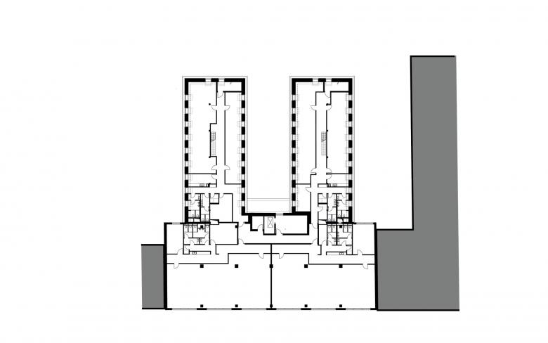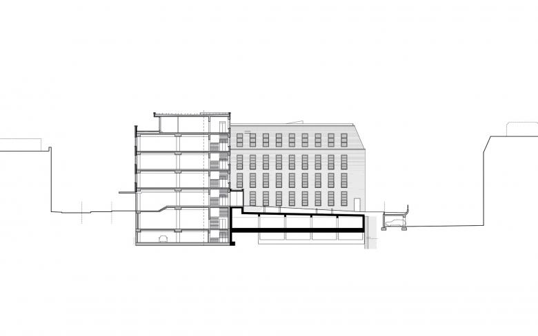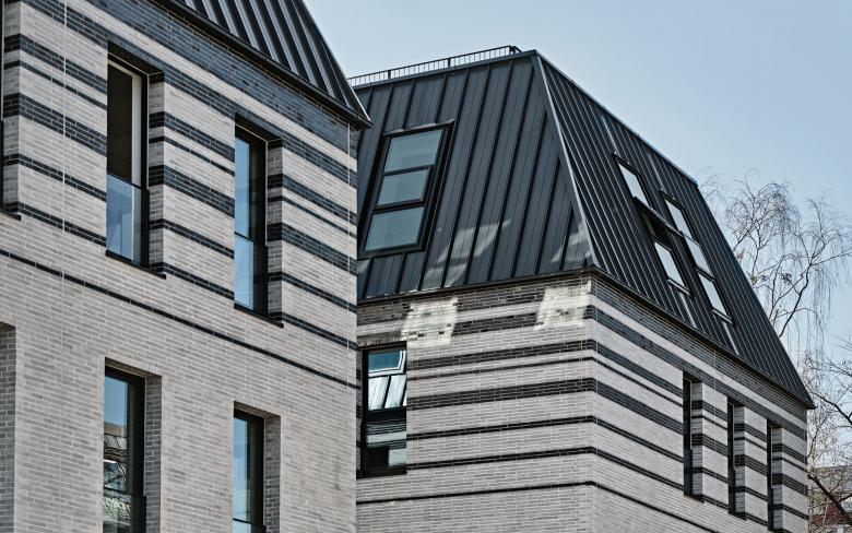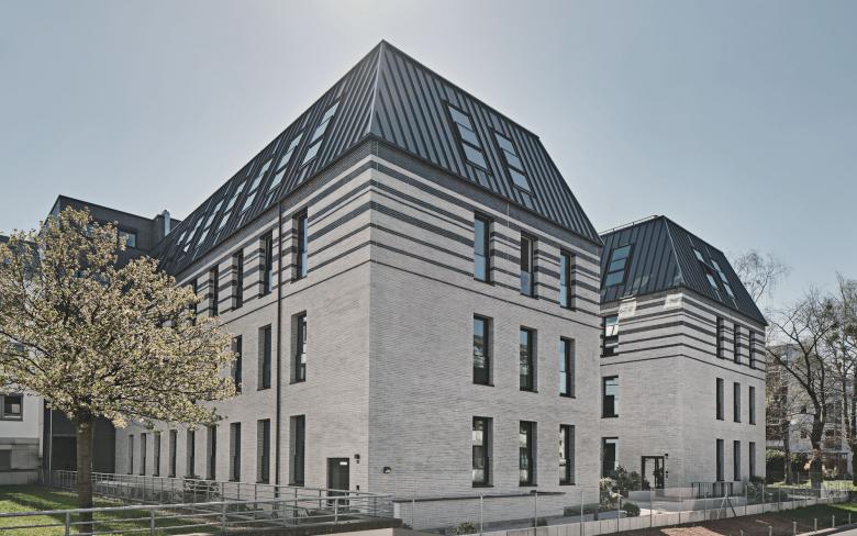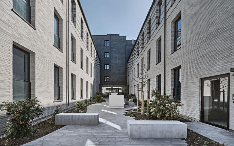 Die strukturelle Anpassung des straßenseitigen Gebäudes aus dem Jahr 1976 an die neuen Anforderungen erlaubt einen Anschluss von zwei Gebäuderiegeln im Innenhof. Die bestehende Bandfassade wird durch eine schwarze, minimalistische Klinkerfassade ersetzt. Die Neubauten greifen das Motiv der Klinkerfassade auf, kontrastieren aber durch eine expressive Gliederung und schwarzweiß Gestaltung.