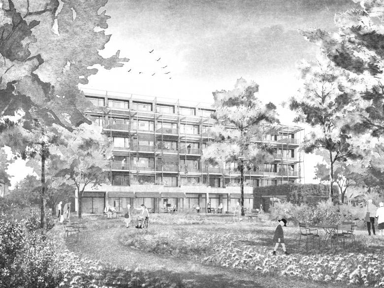 Das bestehende Alterszentrum Bärenmatt wurde als winkelförmiges Volumen konzipiert. Diese Grunddisposition wird durch die Erweiterung erhalten, weitergestrickt und optimiert. Die attraktiven Fassaden gegen Süd-Westen und Süd-Osten bleiben unverbaut. Richtung Nord-Ost wird der bestehende kleinere Gebäudeflügel verlängert und ergänzt. Der Aussenraum wird klar strukturiert und durch eine plausible Adressierung Richtung Zugerstrasse und eine grosszügige Parkanlage Richtung Reuss qualitativ aufgewertet.