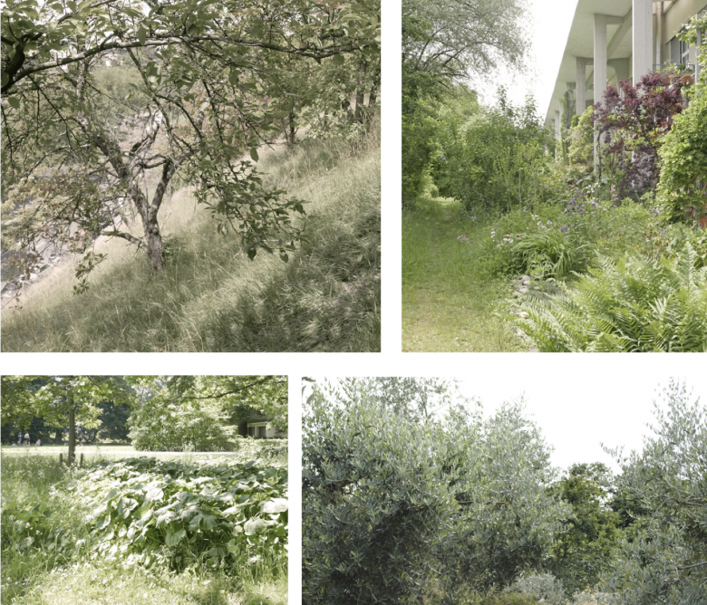 Der Freiraum zeichnet sich aus durch eine klare Erschliessung des Neu- und Umbaus. Eine lange Sitzbank liegt parallel zum Eingangsbereich des Wohnbaus und fängt die Hangkante zum Bitziberg auf. Im Zwischenbereich der beiden Bauten befindet sich ein Gemeinschaftsplatz für Spiel und Aufenthalt. Eine filigrane Pergola spendet Schatten und bildet einen Filter zum Erdgeschoss. Die privaten Aussenbereiche werden durch eine spezifischen Betonplattenbelag im Schottischen Verband ausgebildet. Ein weiterer Spielbereich mit robusten naturnahen Spielelementen liegt am nördlichen Rand der Parzelle. Zartblühende Gehölze, Kiefern und graublaubige Sträucher zeichnen das Vegetationsbild und umhüllen die Bauten. Eine üppige Staudenbepflanzung entwickelt sich in den steileren Partien zu einer vielfältigen Blumenwiese.