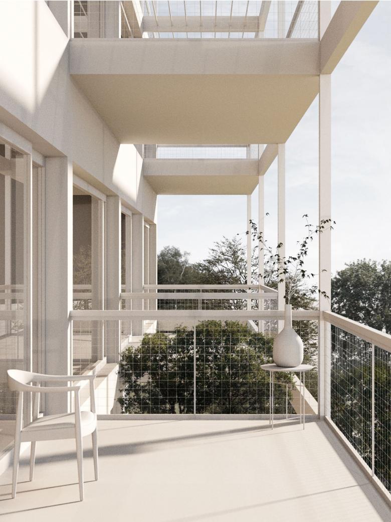 Die L-Förmige Figur des 1. Obergeschosses wird wie das bestehende Erdgeschoss zu einem kompakten Rechteck ergänzt. Markante Dachaufbauten gliedern das Volumen. Eine filigrane Stahlkonstruktion ist dem Volumen auf beiden Längsseiten vorgesetzt, die als begrünten Aussen- und Erschliessungsraum dient. Auf der Westseite ist die Stahlkonstruktion als hängendes, poröses Fachwerk ausgebildet das zueinander versetzte Balkone und feste Pergolen integriert. Auf der Ostseite zum Bitziberg hin dient die Stahlkonstruktion als Erschliessung des ersten Obergeschosses sowie als Schattenspender der Vorgärten der Wohnungen im Erdgeschoss. Seitlich, stellen zwei gewundene Treppen die vertikale Erschliessung über den Laubengang sicher.
