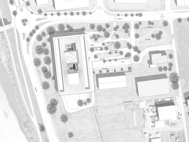 Die Zufahrten für Notfall und Kurzzeitparken werden funktional durch Vegetationsflächen vom Fusswegnetz entflechtet. Ein- und Ausfahrten für Anlieferung und Tiefgarage befinden sich auf der topografischen tieferen Ebene und sind durch eine präzise geführte Mauer von der Parkseite abgerückt.