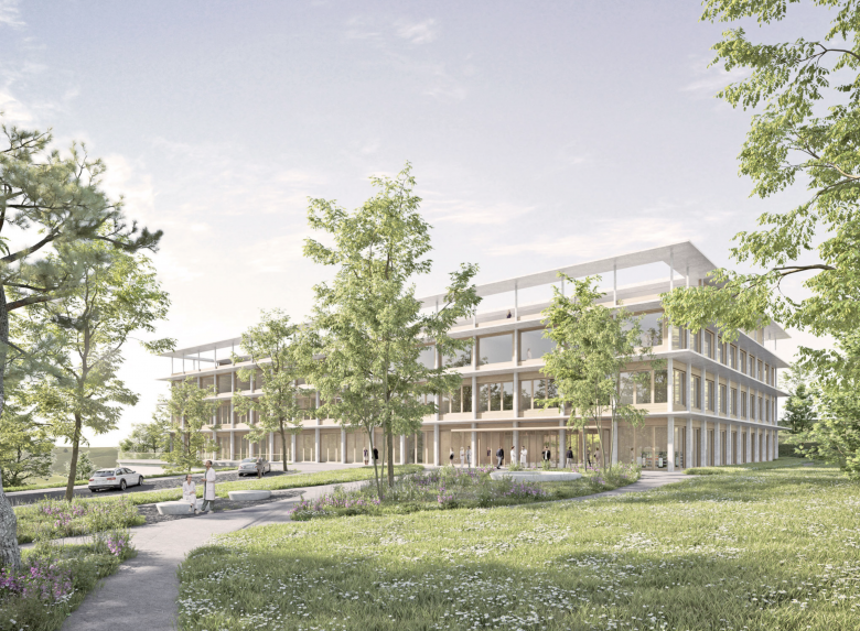 Der kompakte Neubau des Landesspitals Vaduz in unmittelbarer Nähe zum Rhein spielt eine grosszügige Parkanlage auf der Ostseite frei. Ein fein verzweigtes, schwellenloses Wegenetz folgt der sanft ansteigenden Topografie. Die öffentliche Verkehrsanbindung schliesst an der Zollstrasse an und weitet sich mäandrierend von der Haltestelle hoch zum platzartigen Haupteingang des Spitals.