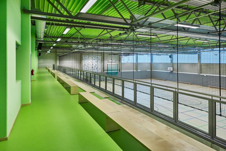PASD plante den Verbindungstrakt mit großen Fenstern und einer Fassade aus sandfarbenem Klinker. Zusammen mit dem Foyer ist er das neue Herzstück der Schule. Er nimmt die städtebauliche Struktur der Bestandsgebäude von 1935 auf und fügt sich hervorragend in das Gesamtensemble ein. Mit seiner gradlinigen, modernen Architektur fällt der Verbindungsbau gleichzeitig auf. Kopfbauten ergänzen das Gesamtensemble städtebaulich und markieren wichtige Eckpunkte nach Norden und nach Süden. Dazu gehört am nordöstlichen Abschluss des Campus auch der Neubau der Turnhalle.