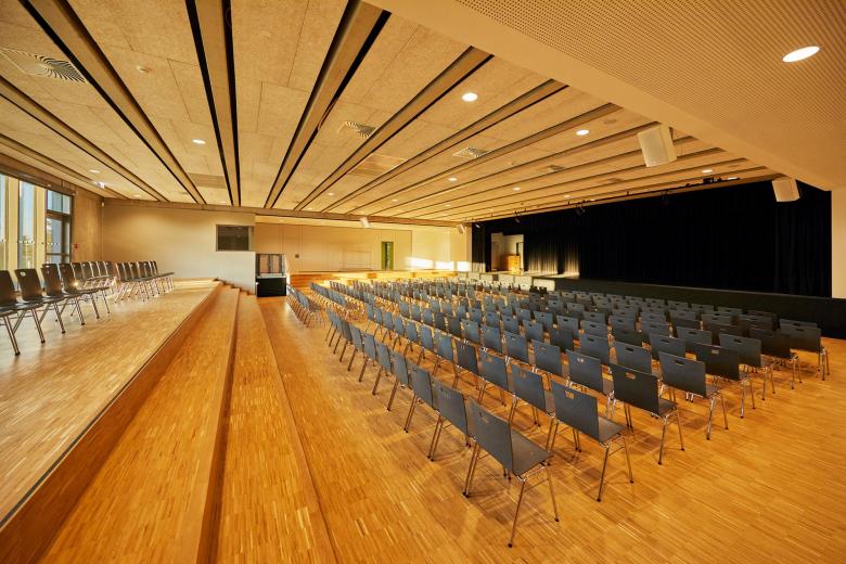 Das Foyer ist zusammen mit Pausenhalle und Aula in einem eingeschossigen Baukörper auf dem ehemaligen Vorplatz des Gebäudeensembles untergebracht, der außerdem zentraler Eingangsbereich ist. Der Baukörper bildet zusammen mit dem Verbindungstrakt das neue Gesicht der Schule. Auf dem Dach ist ein großzügiger, extensiv begrünter Aufenthaltsbereich konzipiert, den die Sekundarstufe ll als Schulhof nutzt. Zugunsten eines weiteren Schulhofs für die Sekundarstufe I wurde ein ehemaliger Parkplatz rückgebaut und über weite Teile mit Grünflächen versehen. Zahlreiche Spielmöglichkeiten dort sorgen für ausreichende Bewegungsfreiheit der Kinder.
