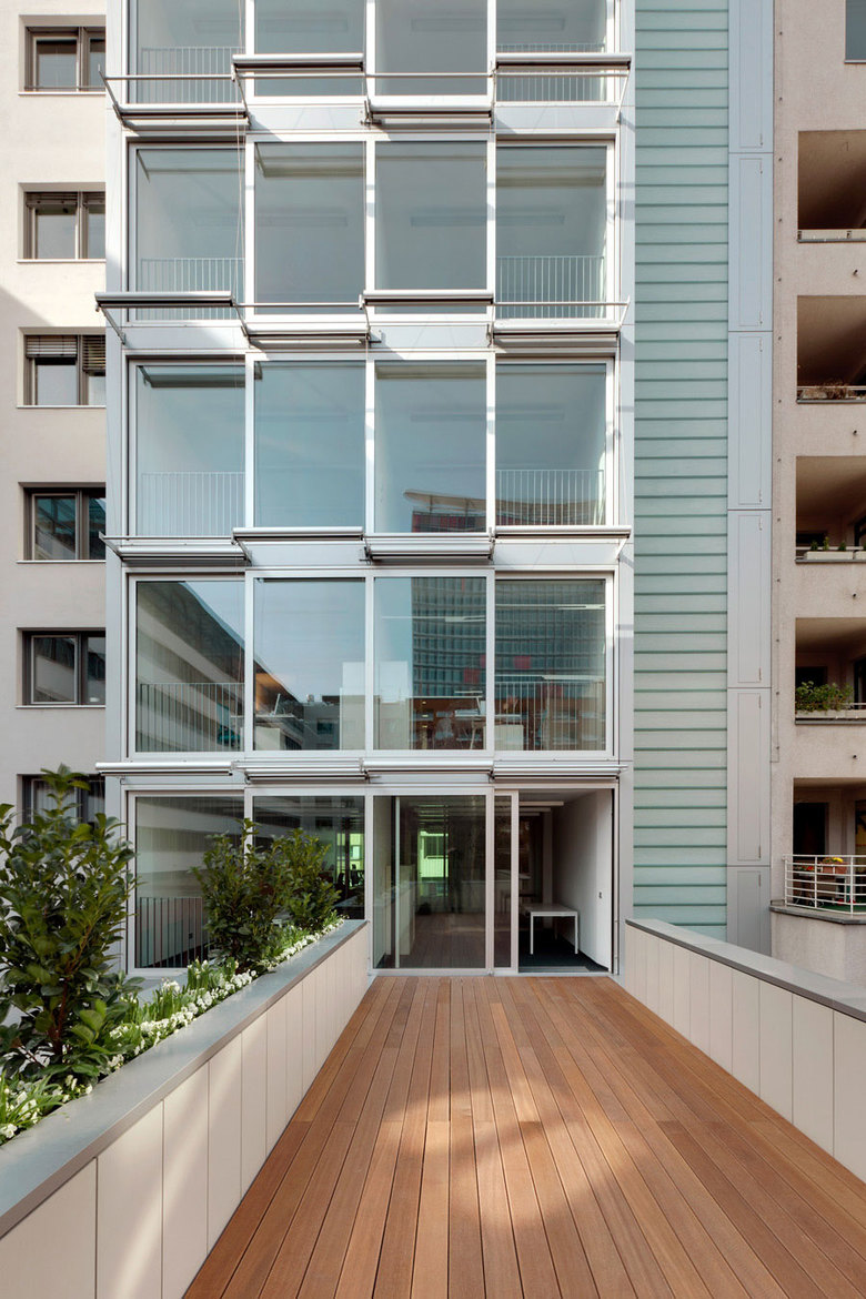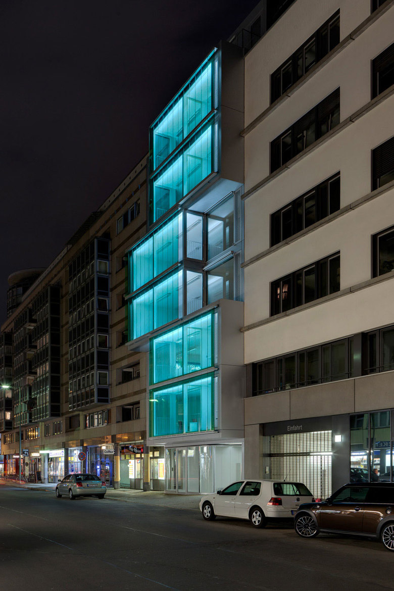 In der südlichen Friedrichvorstadt befindet sich die Liegenschaft Friedrichstraße 40. Ein Ort, der wie seine Umgebung über Jahre kulturell durchsetzt - von Literaten und Künstlern bewohnt war. Die Grundstücksfläche war zunächst mit einem zweigeschossigen Wohnhaus und später mehrgeschossig, hoch verdichtet mit Vor- und Hintergebäude dicht besetzt. Hier wohnten die Brüder Skadamowski, die als Erfinder der 3-D Brille aber auch der Kinematografie in Deutschland gelten. Die kulturelle Prägung, das nördlich – zwischen Koch- und Leipziger Straße – angrenzende Quartier der Kurzweiligkeit sowie die Einkaufsmeile Friedrichstrasse jenseits der Leipziger sorgten in der Vergangenheit für hohe Besucherfrequenzen. Der ehemalige Grenzkontrollpunkt „Checkpoint Charlie“ markiert heute historische Ereignisse. Er ist nicht weit entfernt und von der Friedrichstraße 40 gut sichtbar. Das neue Haus schließt die letzte Lücke im Straßenbild. Die Friedrichstrasse hat hier eine deutlich urbane Charakteristik, die Hoffläche ähnelt einem großen Garten. So werden wir die Flächen der sieben Obergeschosse raumgreifend, so tief wie möglich in das Grundstück hineinführen. Sie werden als offene Grundrisse variabel in der Nutzung sein. Die Fassade zur Friedrichstrasse wird technisch präzise formuliert, vollkommen transparent mit vertikalen Glaslamellen zum Schutz gegen Aufheizung und zweigeschossigen Erkern, die das Haus mit der Umgebung verknüpfen – eine städtische Aussage. Die Gartenfassade ist anders - ebenfalls präzise aber mit Schiebetüren, raumhoch, für große Öffnungen, aus denen man sich hinauslehnen kann. Der Sonnenschutz wird aus textilem Material „geflochten“. Im Innenraum treffen Glas, Holz und Textil aufeinander – hier werden Stadt und Garten miteinander verwoben. Die bildhafte Interpretation des Ortes durch Antje Schiffers begleitet den Weg durch die öffentlichen Bereiche des Hauses. Nachhaltigkeit in Konstruktion und Technik sowie der Medienversorgung sind bereits mit dem Gütesiegel GOLD durch die DGNB vorzertifiziert.