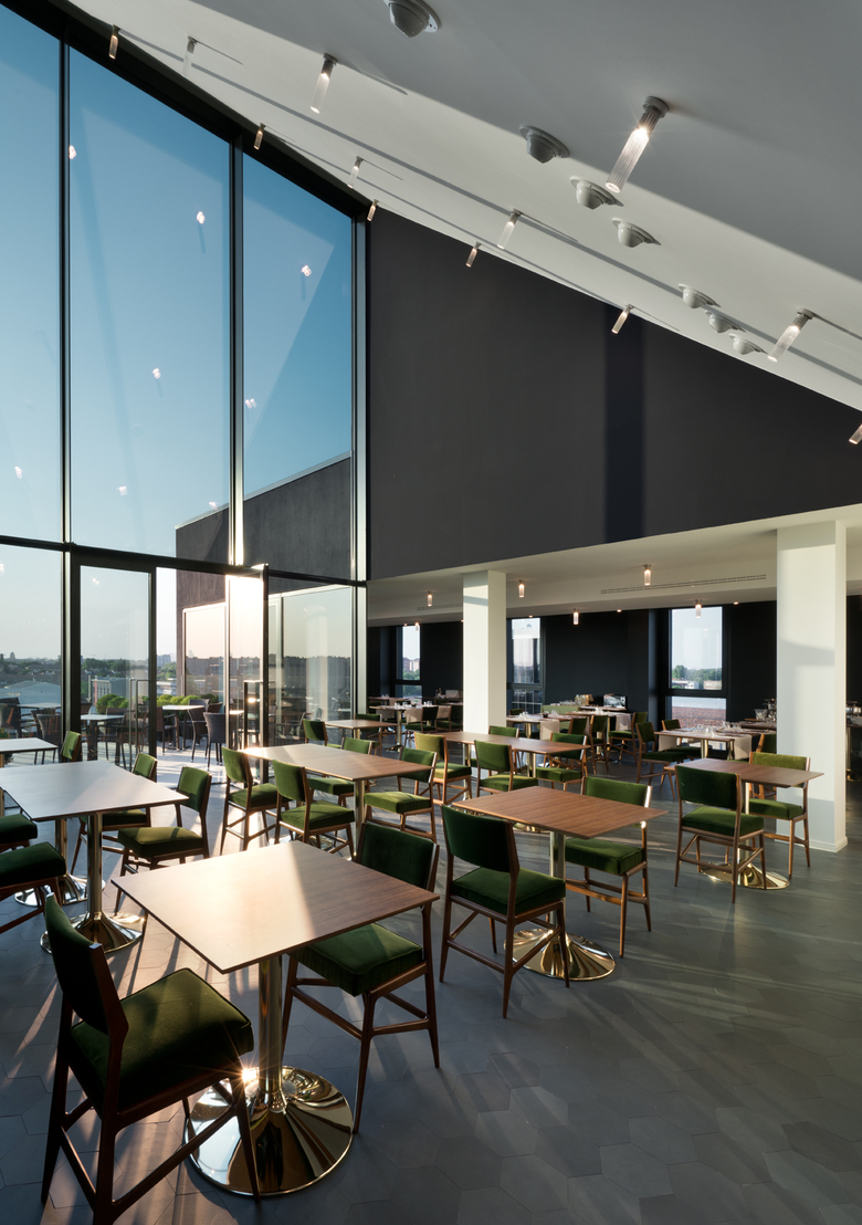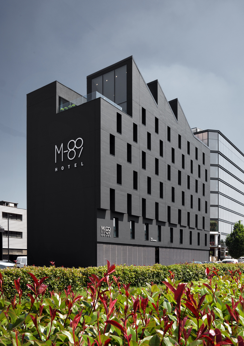 Opposite the building, there is the rhythmic series of brick blocks of the Caproni factory, with their shed roof and industrial archaeology charm: the M89 Hotel – the new four-star destination at number 89 of via Mecenate– faces the factory halls that one hundred years ago hosted one of the leading aviation companies and which are now home to Gucci, after a meticulous renovation and expansion project by Piuarch. The dialogue with the surrounding urban fabric – fulcrum of the concept applied to the over 35,000 m2 of the production plant occupied by the fashion company–, also defines the project for the hotel facility, whose building is designed in continuity with the pre-existing volumes, enhancing the architectural identity of the neighbourhood.On the outside, the hotel hints at the outline of factory halls: the ground floor features a wide glass wall with a metal grate, at the same height of the industrial buildings as an ideal continuation of the permeable elevation. The roof, instead, reinterprets the industrial shed system in a contemporary key and takes a step back to leave room to the terrace, framed by full-height glass walls. A black plastered façade envelops the 55 rooms, that boast the same minimalist character of its façade. Their business vocation inspires a streamline design, revolving around refined colour contrasts between anthrax grey, white, green and walnut.