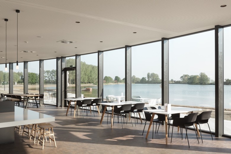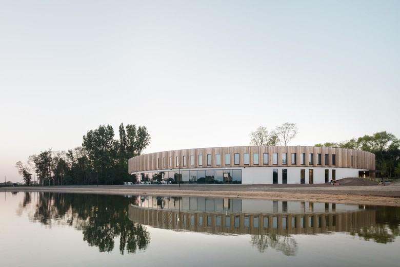 Domein Polderwind ligt naast een grote waterplas in het ruige natuurlandschap van de West-Vlaamse polders. Het cirkelvormige volume – of beter, een stapeling van een dubbele ‘torus’ met ongelijk middelpunt – werpt een blik van 360° op deze weidse omgeving. Het lage gebouw met houten gevels stelt zich bescheiden op in het landschap.